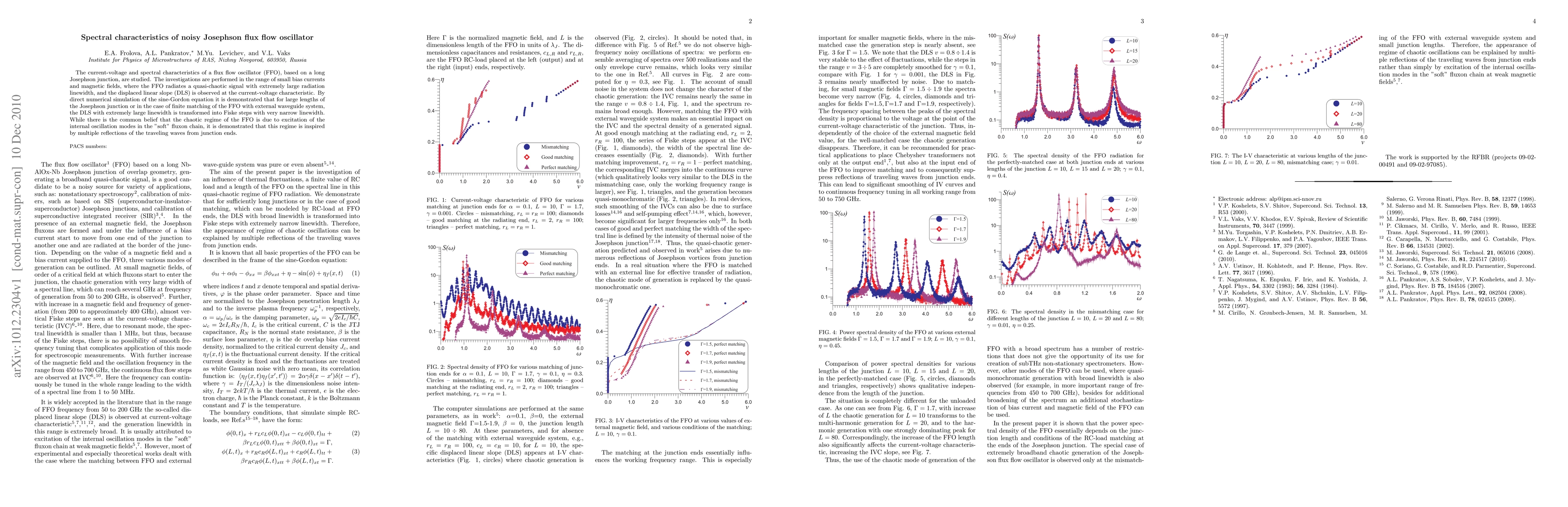 This paper investigates the spectral characteristics of a noisy Josephson flux flow oscillator (FFO) under small bias currents and magnetic fields, revealing quasi-chaotic radiation with a large linewidth. It demonstrates that the transition from a displaced linear slope to Fiske steps is due to multiple reflections of traveling waves rather than internal oscillation modes.
