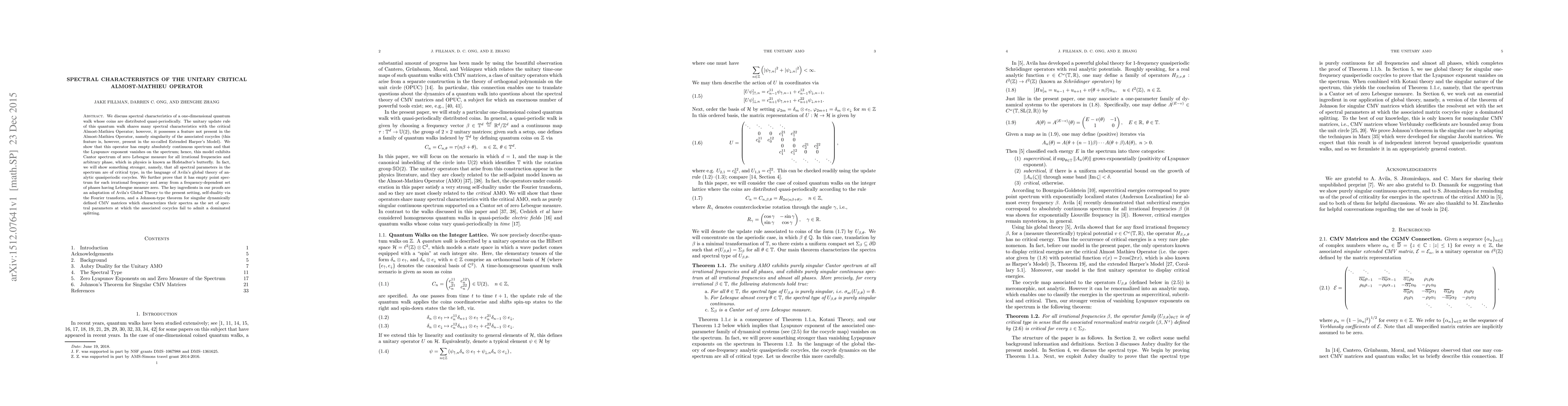 We discuss spectral characteristics of a one-dimensional quantum walk whose coins are distributed quasi-periodically. The unitary update rule of this quantum walk shares many spectral characteristics with the critical Almost-Mathieu Operator; however, it possesses a feature not present in the Almost-Mathieu Operator, namely singularity of the associated cocycles (this feature is, however, present in the so-called Extended Harper's Model). We show that this operator has empty absolutely continuous spectrum and that the Lyapunov exponent vanishes on the spectrum; hence, this model exhibits Cantor spectrum of zero Lebesgue measure for all irrational frequencies and arbitrary phase, which in physics is known as Hofstadter's butterfly. In fact, we will show something stronger, namely, that all spectral parameters in the spectrum are of critical type, in the language of Avila's global theory of analytic quasiperiodic cocycles. We further prove that it has empty point spectrum for each irrational frequency and away from a frequency-dependent set of phases having Lebesgue measure zero. The key ingredients in our proofs are an adaptation of Avila's Global Theory to the present setting, self-duality via the Fourier transform, and a Johnson-type theorem for singular dynamically defined CMV matrices which characterizes their spectra as the set of spectral parameters at which the associated cocycles fail to admit a dominated splitting.