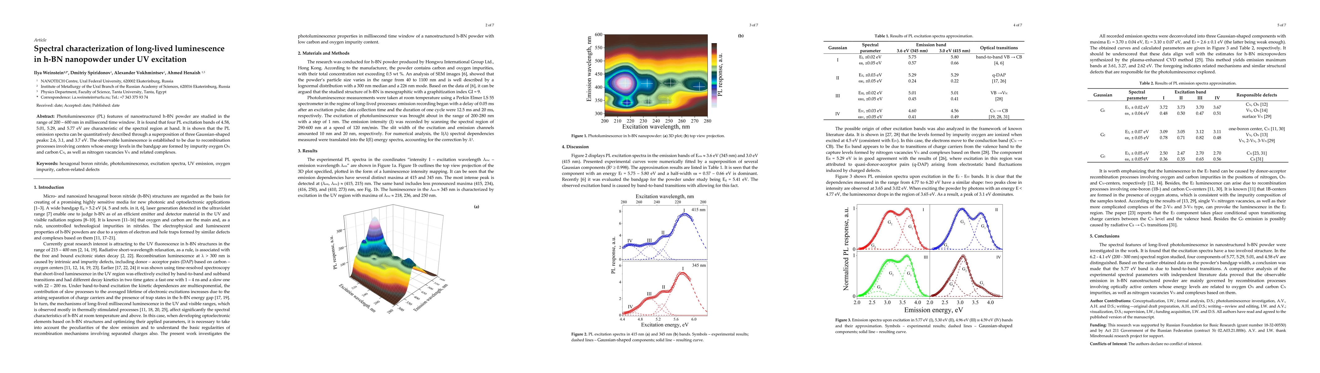 Photoluminescence (PL) features of nanostructured h-BN powder are studied in the range of 200-600 nm in millisecond time window. It is found that four PL excitation bands of 4.58, 5.01, 5.29, and 5.77 eV are characteristic of the spectral region at hand. It is shown that the PL emission spectra can be quantitatively described through a superposition of three Gaussian-shaped peaks: 2.6, 3.1, and 3.7 eV. The observable luminescence is established to be due to recombination processes involving centers whose energy levels in the bandgap are formed by oxygen and carbon impurities, as well as nitrogen vacancies and related complexes.