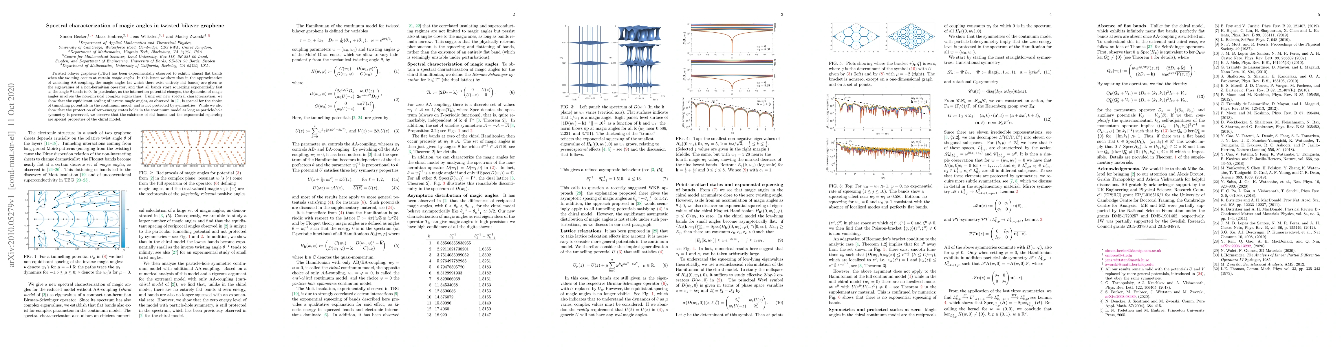 This research reveals new insights into the electronic band structure of twisted bilayer graphene, identifying "magic angles" where flat bands occur. It shows that these angles are linked to the eigenvalues of a non-Hermitian operator, with bands squeezing exponentially near these angles, emphasizing that the equidistant scaling of inverse magic angles is model-specific rather than symmetry-protected.