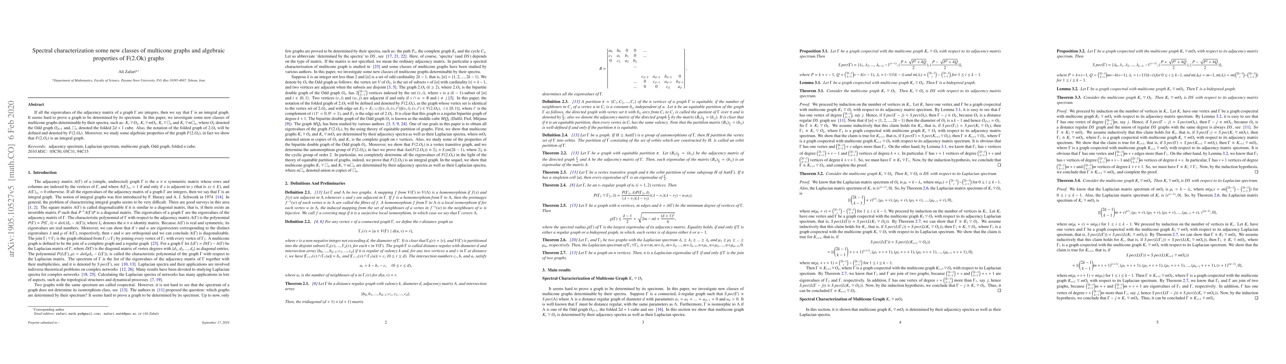 If all the eigenvalues of the adjacency matrix of a graph $\Gamma$ are integers, then we say that $\Gamma$ is an integral graph. It seems hard to prove a graph to be determined by its spectrum. In this paper, we investigate some new classes of multicone graphs determinable by their spectra, such as: $K_v \bigtriangledown O_k$, $K_v \bigtriangledown mO_k$, $K_v \bigtriangledown \Box_n$ and $K_v \bigtriangledown m\Box_n$, where $O_k$ denoted the Odd graph $O_{d+1}$ and, $\Box_n$ denoted the folded $2d+1$ cube. Also, the notation of the folded graph of $2.O_k$ will be defined and denoted by $F(2.O_k)$. Moreover, we study some algebraic properties of the graph $F(2.O_k)$, in fact we show that $F(2.O_k)$ is an integral graph.