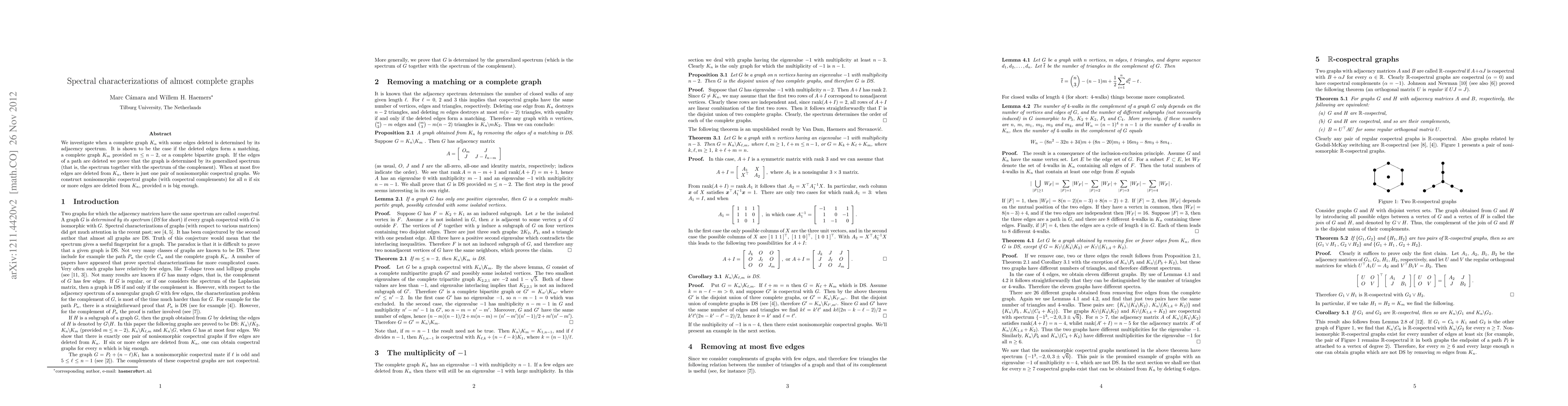 A graph is determined by its adjacency spectrum if edges form a matching, complete graph K_m (m < n-2), or complete bipartite graph. For more than 5 deleted edges, nonisomorphic cospectral graphs exist for sufficiently large n.
