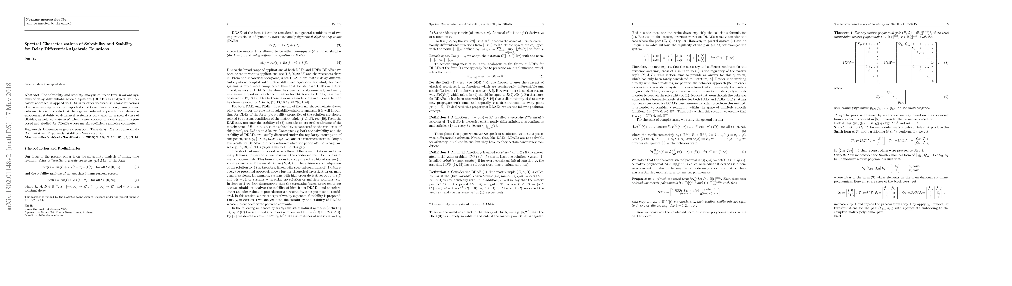 The solvability and stability analysis of linear time invariant systems of delay differential-algebraic equations (DDAEs) is analyzed. The behavior approach is applied to DDAEs in order to establish characterizations of their solvability in terms of spectral conditions. Furthermore, examples are delivered to demonstrate that the eigenvalue-based approach to analyze the exponential stability of dynamical system is only valid for a special class of DDAEs, namely non-advanced. Then, a new concept of weak stability is proposed and studied for DDAEs whose matrix coefficients pairwise commute.