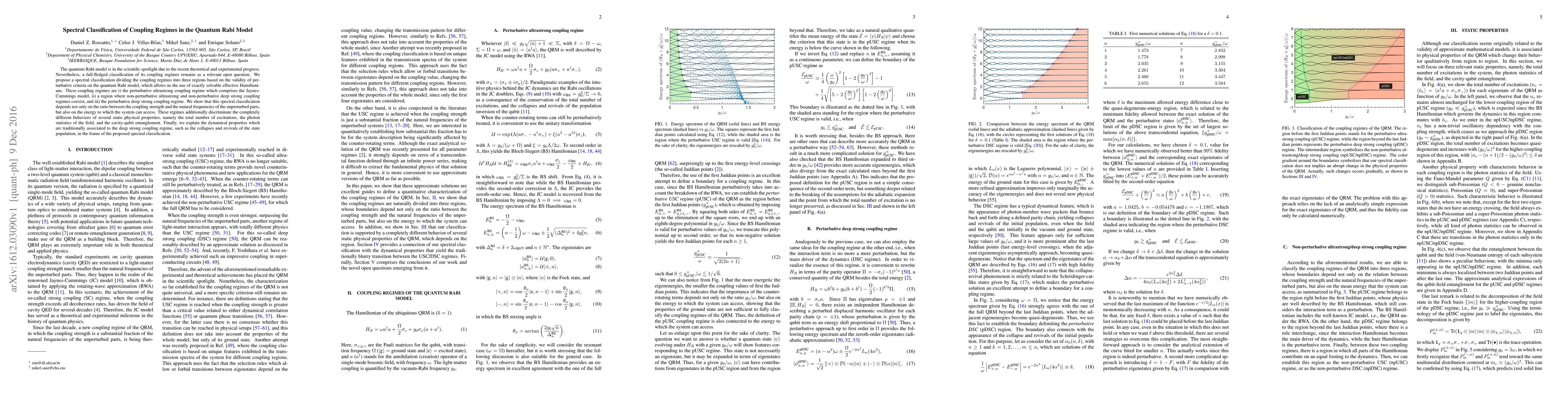 The paper proposes a spectral classification of coupling regimes in the quantum Rabi model, dividing them into three regions based on perturbative criteria and effective Hamiltonians. This classification reveals distinct behaviors in physical properties and dynamical phenomena like collapses and revivals.