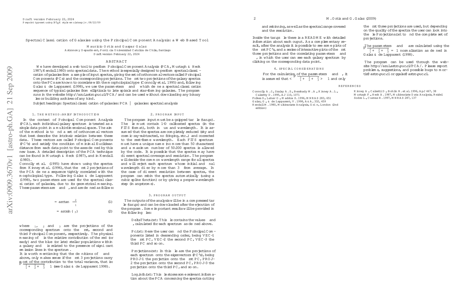 We have developed a web tool to perform Principal Component Analysis (PCA, Murtagh & Heck 1987; Kendall 1980) onto spectral data. The method is especially designed to perform spectral classification of galaxies from a sample of input spectra, giving the set of orthonormal vectors called Principal Components (PCs) and the corresponding projections. The first two projections of the galaxy spectra onto the PCs are known to correlate with the morphological type (Connolly et al. 1995) and, following Galaz & de Lapparent (1998), we use the parameters \delta and \theta which define a spectral classification sequence of typical galaxies from ellipticals to late spirals and star-forming galaxies. The program runs in the website http://azul.astro.puc.cl/PCA/ and can be used without downloading any binary files or building archives of any kind.