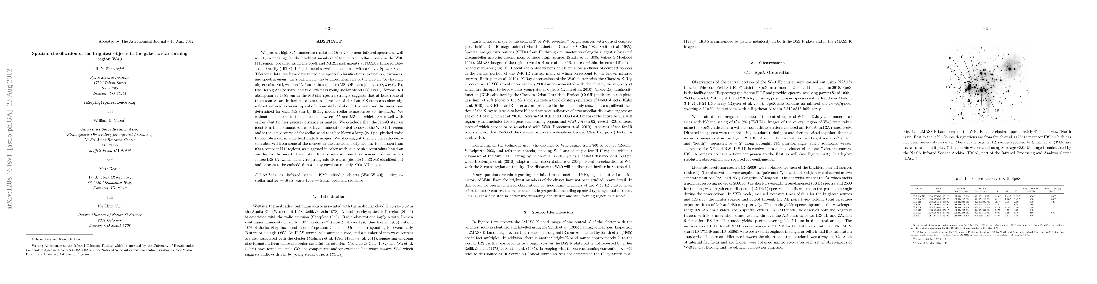 We present high S/N, moderate resolution near-infrared spectra, as well as 10 micron imaging, for the brightest members of the central stellar cluster in the W40 HII region, obtained using the SpeX and MIRSI instruments at NASA's Infrared Telescope Facility. Using these observations combined with archival Spitzer Space Telescope data, we have determined the spectral classifications, extinction, distances, and spectral energy distributions for the brightest members of the cluster. Of the eight objects observed, we identify four main sequence (MS) OB stars, two Herbig Ae/Be stars, and two low-mass young stellar objects. Strong HeI absorption at 1.083 micron in the MS star spectra strongly suggests that at least some of these sources are in fact close binaries. Two out of the four MS stars also show significant infrared excesses typical of circumstellar disks. Extinctions and distances were determined for each MS star by fitting model stellar atmospheres to the SEDs. We estimate a distance to the cluster of between 455 and 535 pc, which agrees well with earlier (but far less precise) distance estimates. We conclude that the late-O star we identify is the dominant source of LyC luminosity needed to power the W40 HII region and is the likely source of the stellar wind that has blown a large (~4 pc) pinched-waist bubble observed in wide field mid-IR images. We also suggest that 3.6 cm radio emission observed from some of the sources in the cluster is likely not due to emission from ultra-compact HII regions, as suggested in other work, due to size constraints based on our derived distance to the cluster. Finally, we also present a discussion of the curious source IRS 3A, which has a very strong mid-IR excess (despite its B3 MS classification) and appears to be embedded in a dusty envelope roughly 2700 AU in size.