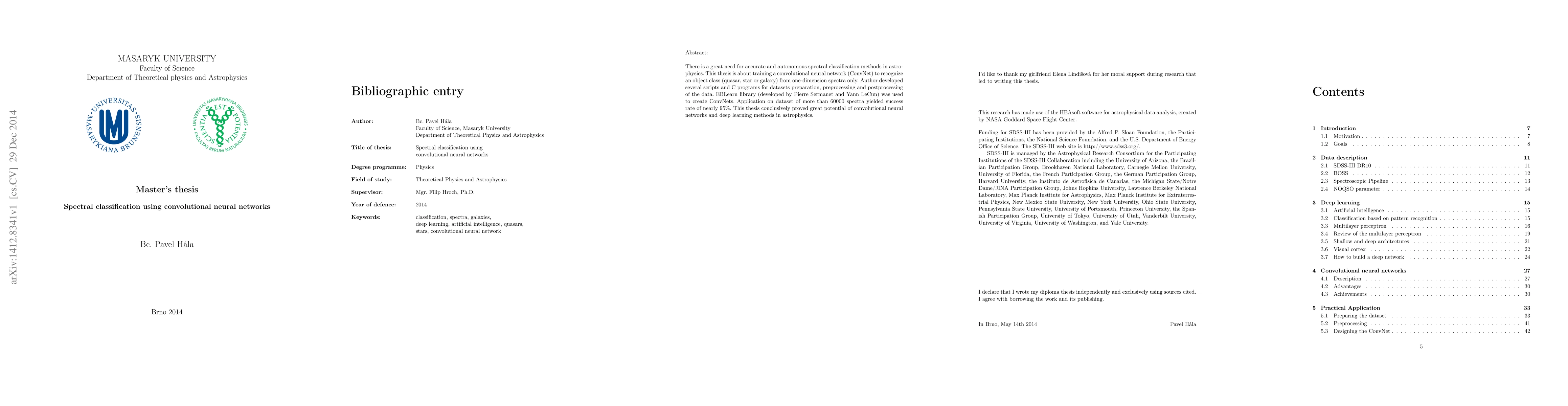 There is a great need for accurate and autonomous spectral classification methods in astrophysics. This thesis is about training a convolutional neural network (ConvNet) to recognize an object class (quasar, star or galaxy) from one-dimension spectra only. Author developed several scripts and C programs for datasets preparation, preprocessing and postprocessing of the data. EBLearn library (developed by Pierre Sermanet and Yann LeCun) was used to create ConvNets. Application on dataset of more than 60000 spectra yielded success rate of nearly 95%. This thesis conclusively proved great potential of convolutional neural networks and deep learning methods in astrophysics.