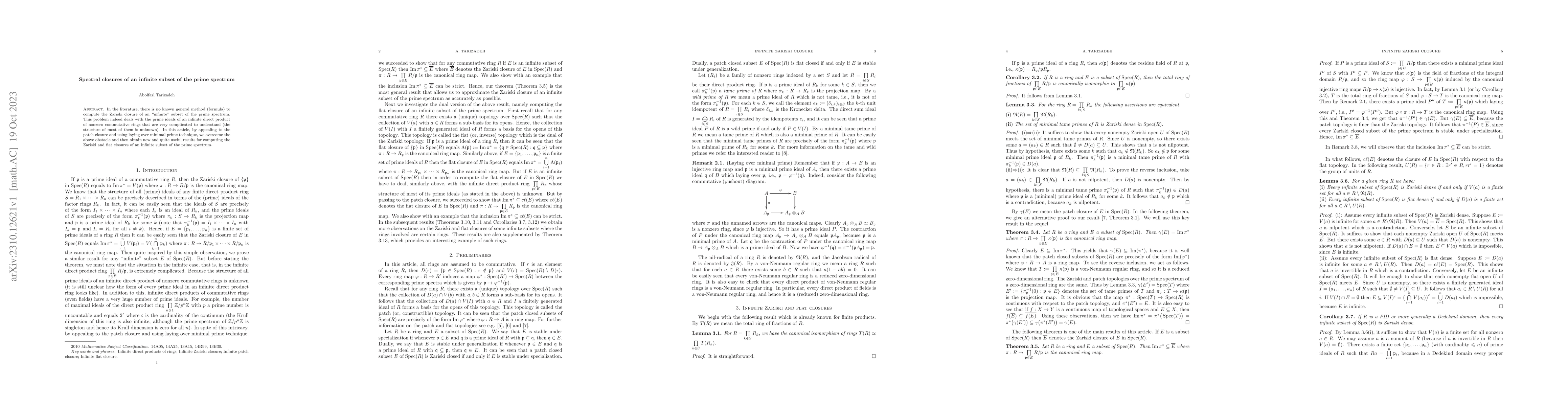 In the literature, there is no known general method (formula) to compute the Zariski closure of an ``infinite'' subset of the prime spectrum. This problem indeed deals with the prime ideals of an infinite direct product of nonzero commutative rings that are very complicated to understand (the structure of most of them is unknown). In this article, by appealing to the patch closure and using laying over minimal prime technique, we overcome the above obstacle and then obtain new and quite useful results for computing the Zariski and flat closures of an infinite subset of the prime spectrum.