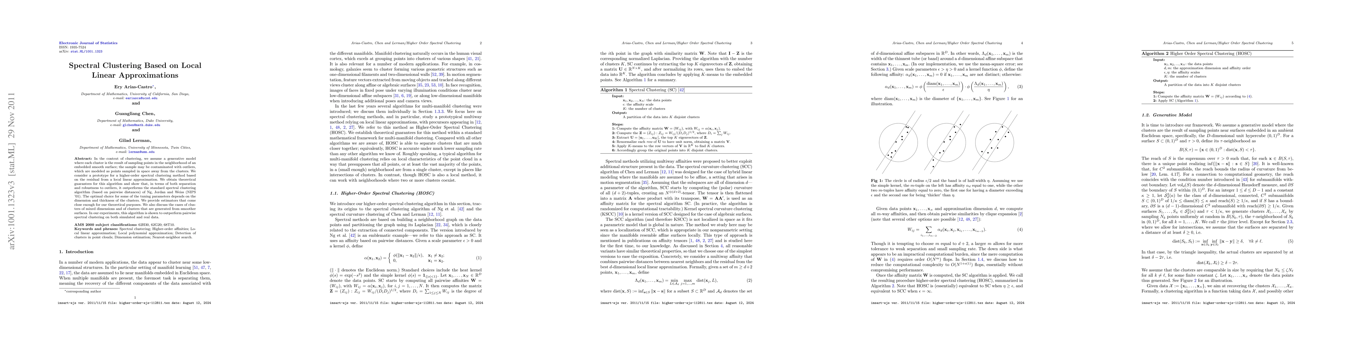 In the context of clustering, we assume a generative model where each cluster is the result of sampling points in the neighborhood of an embedded smooth surface; the sample may be contaminated with outliers, which are modeled as points sampled in space away from the clusters. We consider a prototype for a higher-order spectral clustering method based on the residual from a local linear approximation. We obtain theoretical guarantees for this algorithm and show that, in terms of both separation and robustness to outliers, it outperforms the standard spectral clustering algorithm (based on pairwise distances) of Ng, Jordan and Weiss (NIPS '01). The optimal choice for some of the tuning parameters depends on the dimension and thickness of the clusters. We provide estimators that come close enough for our theoretical purposes. We also discuss the cases of clusters of mixed dimensions and of clusters that are generated from smoother surfaces. In our experiments, this algorithm is shown to outperform pairwise spectral clustering on both simulated and real data.