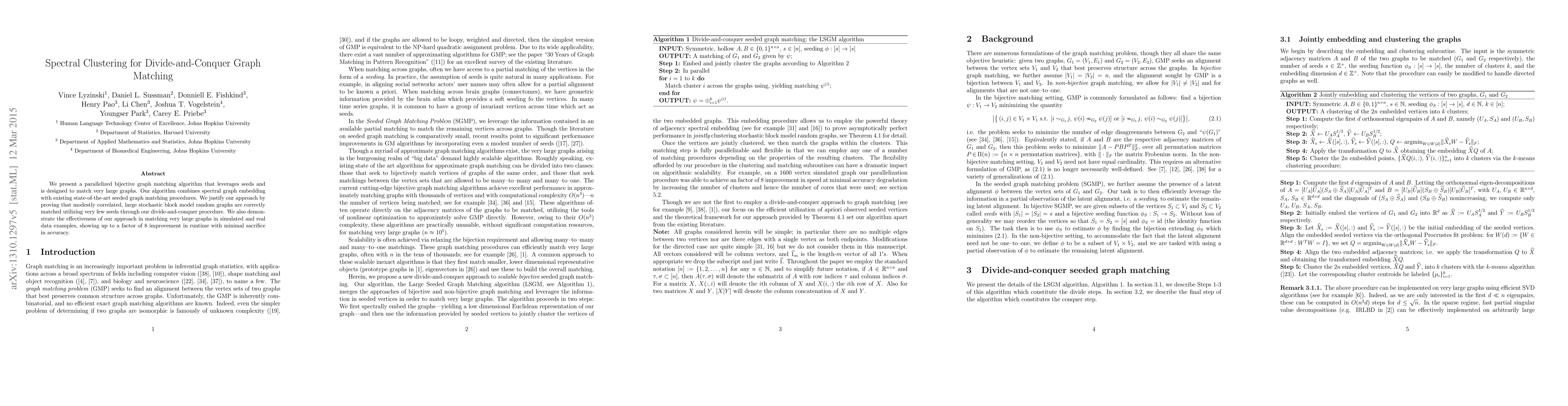 This paper introduces a parallelized spectral clustering-based graph matching algorithm that uses seeds for matching large graphs efficiently. The method combines spectral graph embedding with seeded graph matching, demonstrating significant runtime improvements up to eight times with minimal loss in accuracy.