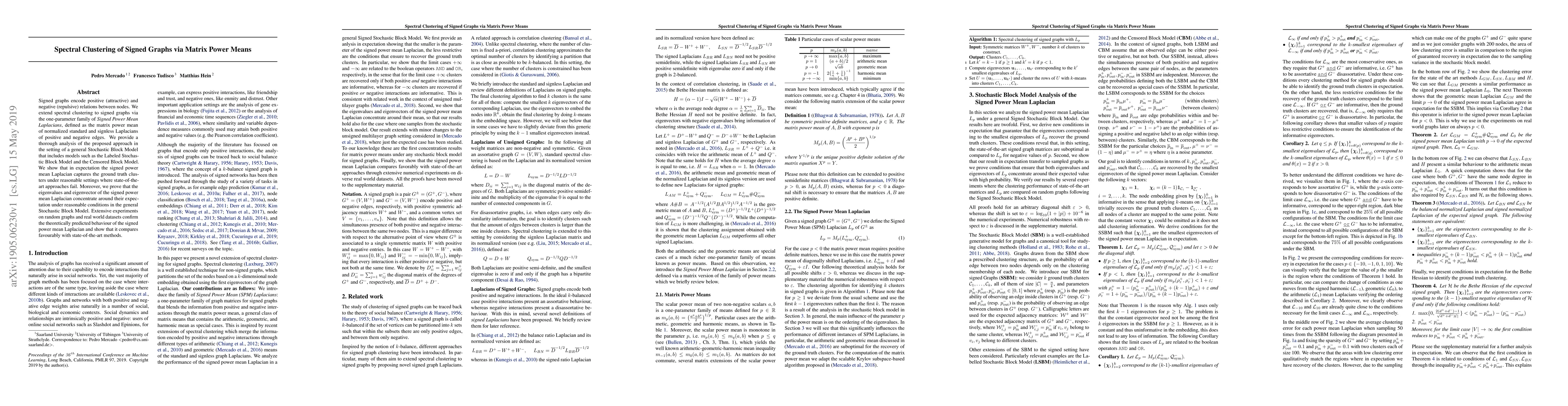 Signed graphs encode positive (attractive) and negative (repulsive) relations between nodes. We extend spectral clustering to signed graphs via the one-parameter family of Signed Power Mean Laplacians, defined as the matrix power mean of normalized standard and signless Laplacians of positive and negative edges. We provide a thorough analysis of the proposed approach in the setting of a general Stochastic Block Model that includes models such as the Labeled Stochastic Block Model and the Censored Block Model. We show that in expectation the signed power mean Laplacian captures the ground truth clusters under reasonable settings where state-of-the-art approaches fail. Moreover, we prove that the eigenvalues and eigenvector of the signed power mean Laplacian concentrate around their expectation under reasonable conditions in the general Stochastic Block Model. Extensive experiments on random graphs and real world datasets confirm the theoretically predicted behaviour of the signed power mean Laplacian and show that it compares favourably with state-of-the-art methods.