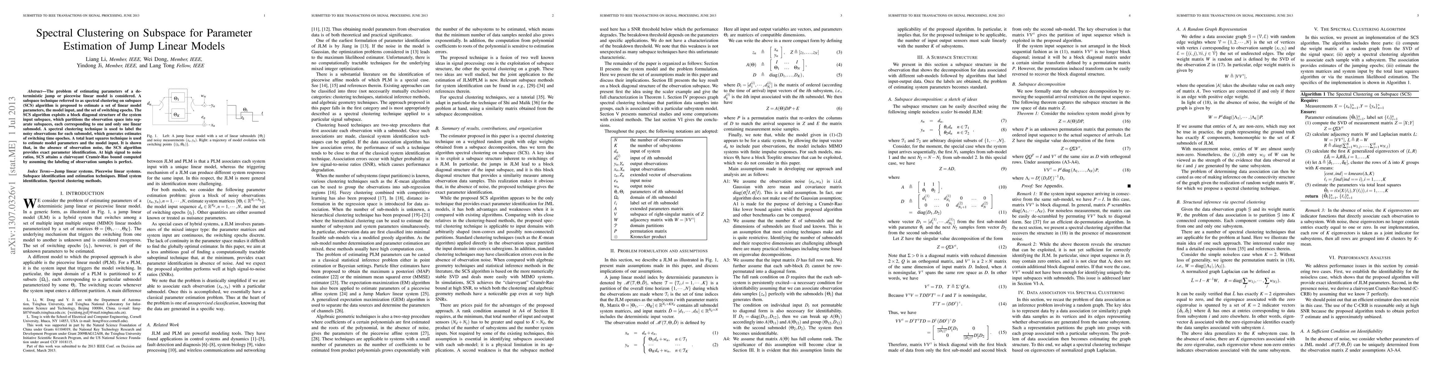 The problem of estimating parameters of a deterministic jump or piecewise linear model is considered. A subspace technique referred to as spectral clustering on subspace (SCS) algorithm is proposed to estimate a set of linear model parameters, the model input, and the set of switching epochs. The SCS algorithm exploits a block diagonal structure of the system input subspace, which partitions the observation space into separate subspaces, each corresponding to one and only one linear submodel. A spectral clustering technique is used to label the noisy observations for each submodel, which generates estimates of switching time epoches. A total least squares technique is used to estimate model parameters and the model input. It is shown that, in the absence of observation noise, the SCS algorithm provides exact parameter identification. At high signal to noise ratios, SCS attains a clairvoyant Cram\'{e}r-Rao bound computed by assuming the labeling of observation samples is perfect.