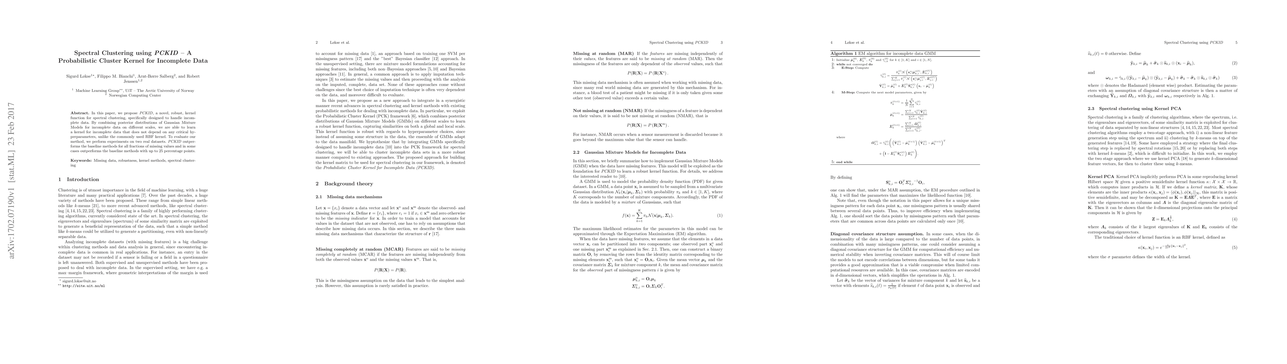 This paper introduces PCKID, a probabilistic cluster kernel for spectral clustering that effectively handles incomplete data. Unlike traditional RBF kernels, PCKID does not rely on critical hyperparameters and outperforms baseline methods on real datasets, especially with higher fractions of missing values.
