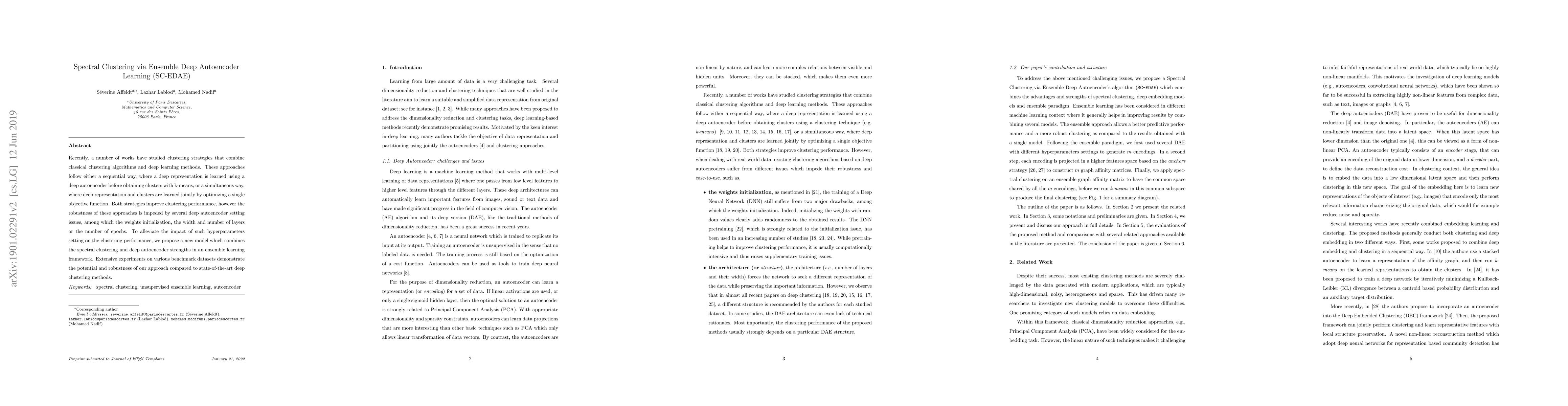 The paper proposes an ensemble deep autoencoder learning model combining spectral clustering and deep autoencoders to improve clustering performance and robustness, addressing issues like weights initialization, layer width, and epochs. Experiments show superior results compared to existing deep clustering methods.