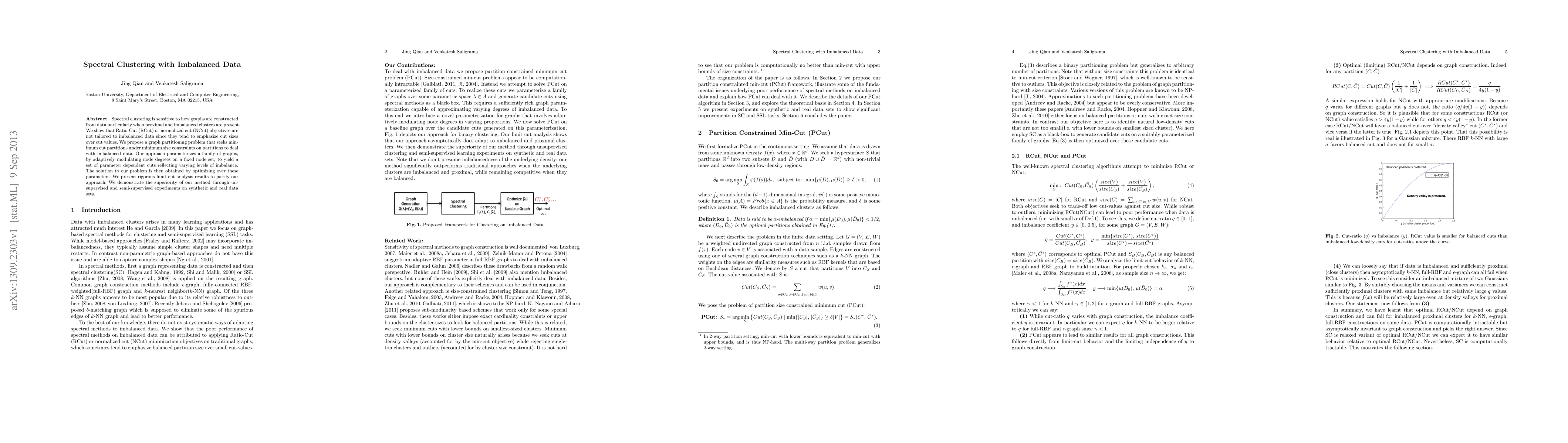 This paper proposes a novel graph partitioning method to address spectral clustering challenges with imbalanced data. It introduces a parameterized approach to minimize cut sizes under size constraints, optimizing over these parameters to achieve better clustering results, and demonstrates its effectiveness through experiments on both synthetic and real datasets.
