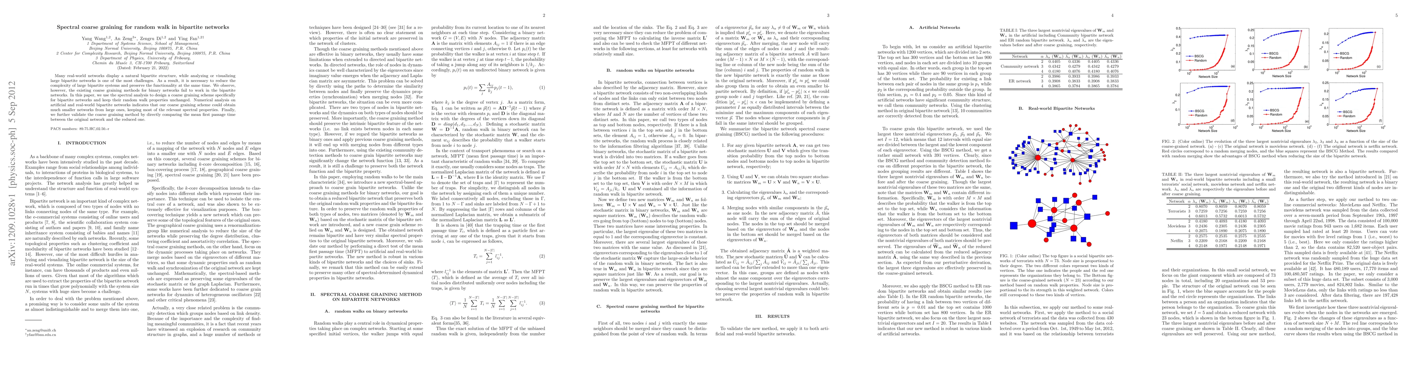 This paper proposes a spectral coarse graining method for simplifying large bipartite networks while preserving their random walk properties. The method successfully reduces network complexity while retaining essential spectral properties, as demonstrated through numerical analysis on both artificial and real-world bipartite networks.