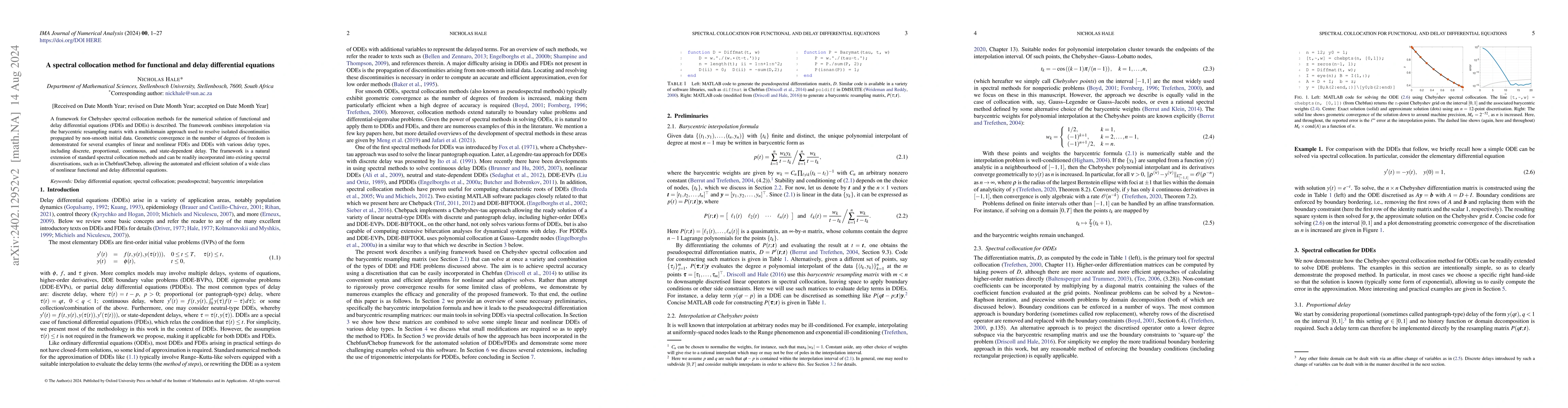 This paper presents a spectral collocation method for solving functional and delay differential equations, combining barycentric resampling for interpolation and a multidomain approach to handle discontinuities. The method demonstrates geometric convergence for various types of delays and extends existing spectral discretizations, facilitating efficient solutions for a broad range of nonlinear differential equations.