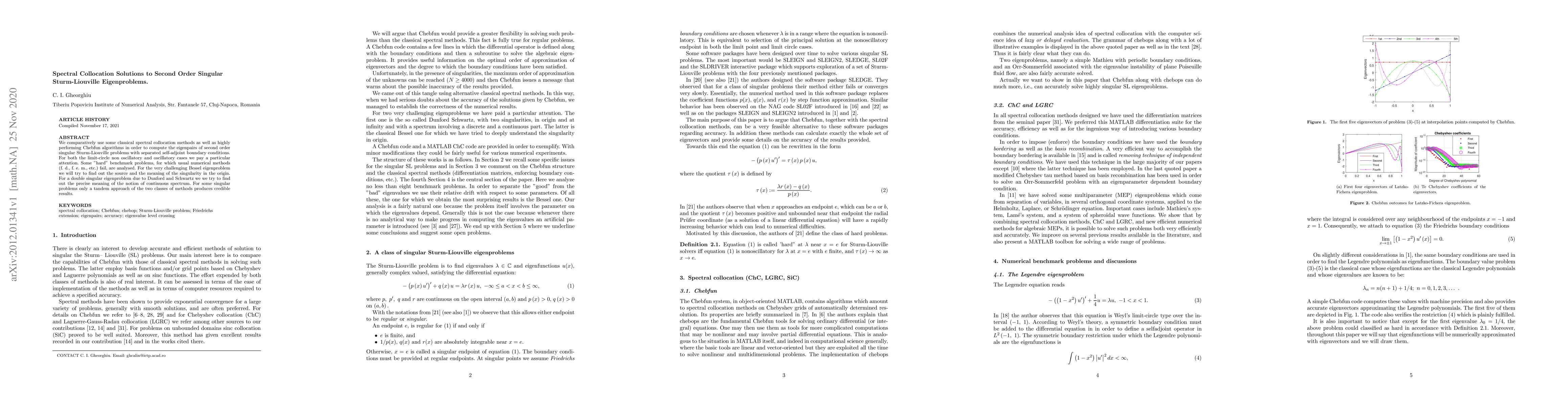 We comparatively use some classical spectral collocation methods as well as highly performing Chebfun algorithms in order to compute the eigenpairs of second order singular Sturm-Liouville problems with separated self-adjoint boundary conditions. For both the limit-circle non oscillatory and oscillatory cases we pay a particular attention. Some "hard" benchmark problems, for which usual numerical methods (f. d., f. e. m., etc.) fail, are analysed. For the very challenging Bessel eigenproblem we will try to find out the source and the meaning of the singularity in the origin. For a double singular eigenproblem due to Dunford and Schwartz we we try to find out the precise meaning of the notion of continuous spectrum. For some singular problems only a tandem approach of the two classes of methods produces credible results.