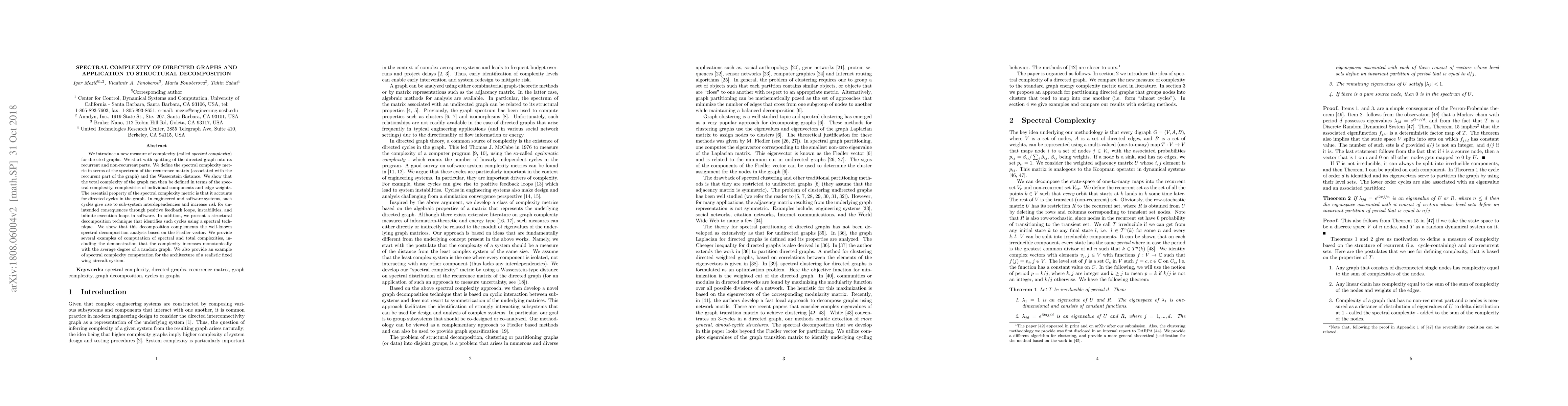 We introduce a new measure of complexity (called spectral complexity) for directed graphs. We start with splitting of the directed graph into its recurrent and non-recurrent parts. We define the spectral complexity metric in terms of the spectrum of the recurrence matrix (associated with the reccurent part of the graph) and the Wasserstein distance. We show that the total complexity of the graph can then be defined in terms of the spectral complexity, complexities of individual components and edge weights. The essential property of the spectral complexity metric is that it accounts for directed cycles in the graph. In engineered and software systems, such cycles give rise to sub-system interdependencies and increase risk for unintended consequences through positive feedback loops, instabilities, and infinite execution loops in software. In addition, we present a structural decomposition technique that identifies such cycles using a spectral technique. We show that this decomposition complements the well-known spectral decomposition analysis based on the Fiedler vector. We provide several examples of computation of spectral and total complexities, including the demonstration that the complexity increases monotonically with the average degree of a random graph. We also provide an example of spectral complexity computation for the architecture of a realistic fixed wing aircraft system.