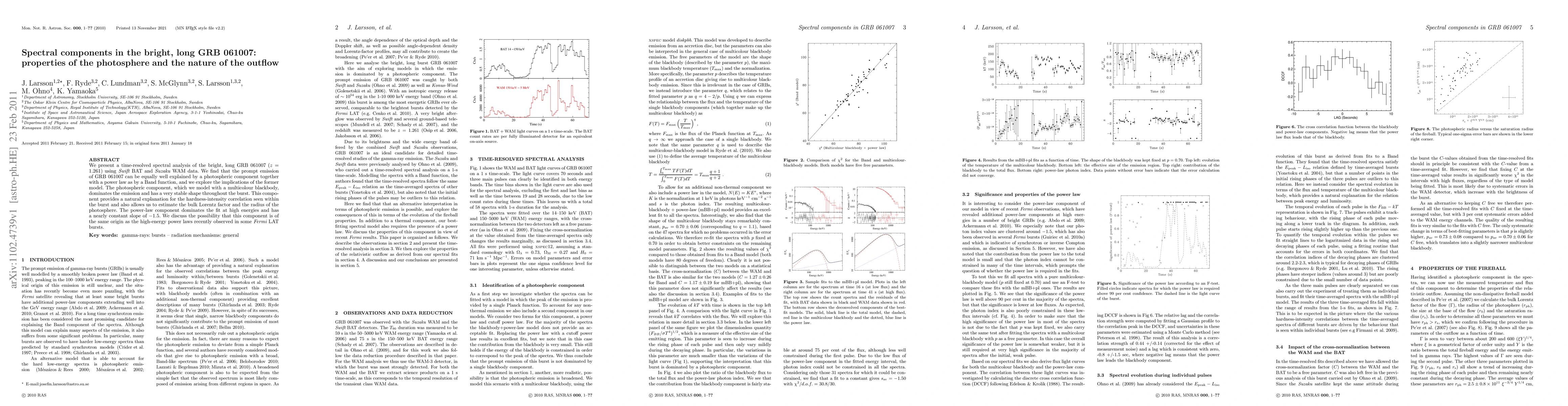 The study analyzes GRB 061007, finding its prompt emission can be modeled with a photospheric component and a power law, equally well as with a Band function. The photospheric component, a stable multicolour blackbody, explains hardness-intensity correlation and allows estimation of the bulk Lorentz factor and photosphere radius. A power-law component, dominant at high energies with a slope of -1.5, may share origin with high-energy power laws in Fermi LAT bursts.