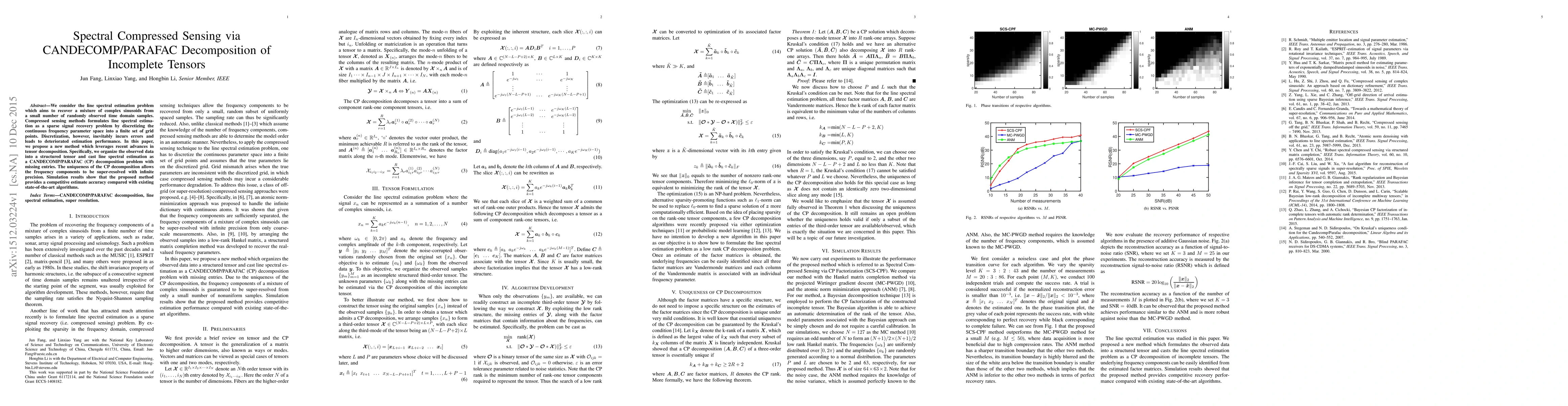 This paper proposes a novel spectral compressed sensing method using CANDECOMP/PARAFAC (CP) decomposition of incomplete tensors to recover complex sinusoids from limited time domain samples. Unlike traditional discretization-based methods, this approach achieves super-resolved frequency components without errors, demonstrating competitive accuracy in simulations.