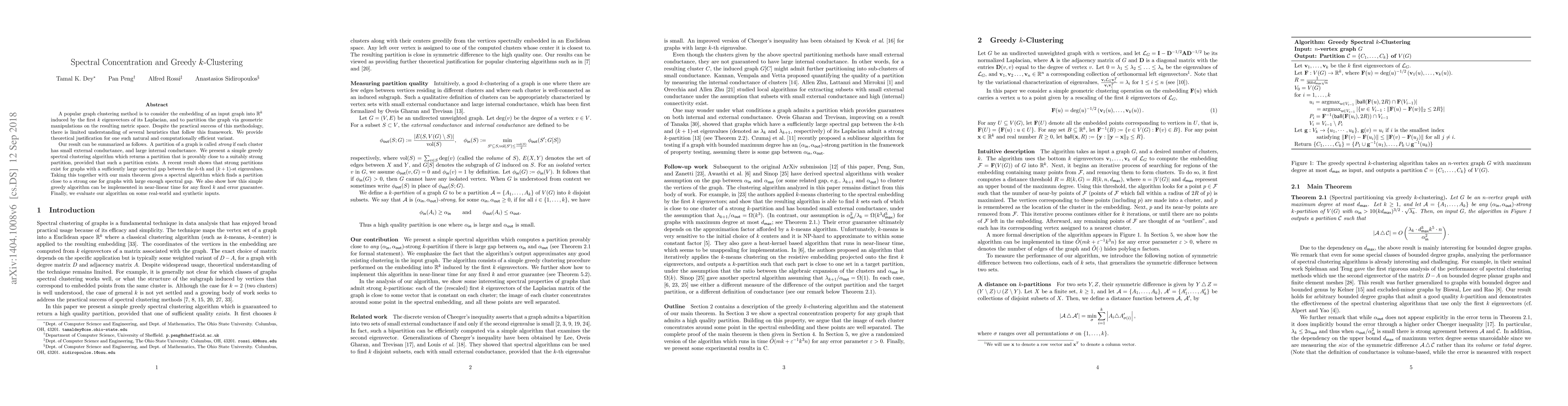 A popular graph clustering method is to consider the embedding of an input graph into R^k induced by the first k eigenvectors of its Laplacian, and to partition the graph via geometric manipulations on the resulting metric space. Despite the practical success of this methodology, there is limited understanding of several heuristics that follow this framework. We provide theoretical justification for one such natural and computationally efficient variant. Our result can be summarized as follows. A partition of a graph is called strong if each cluster has small external conductance, and large internal conductance. We present a simple greedy spectral clustering algorithm which returns a partition that is provably close to a suitably strong partition, provided that such a partition exists. A recent result shows that strong partitions exist for graphs with a sufficiently large spectral gap between the k-th and (k+1)-st eigenvalues. Taking this together with our main theorem gives a spectral algorithm which finds a partition close to a strong one for graphs with large enough spectral gap. We also show how this simple greedy algorithm can be implemented in near-linear time for any fixed k and error guarantee. Finally, we evaluate our algorithm on some real-world and synthetic inputs.