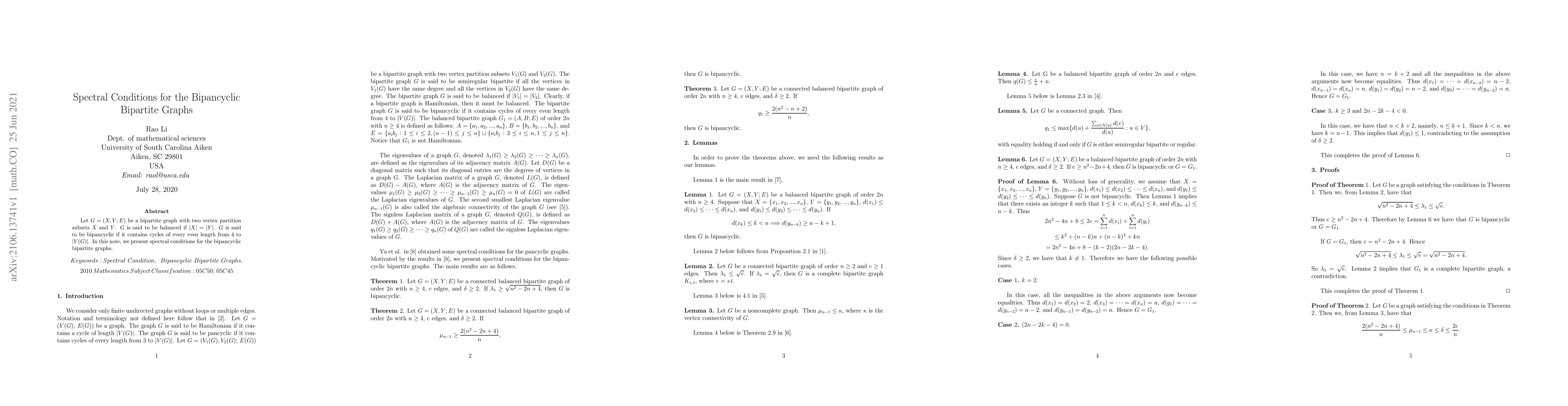 Let $G = (X, Y; E)$ be a bipartite graph with two vertex partition subsets $X$ and $Y$. $G$ is said to be balanced if $|X| = |Y|$. $G$ is said to be bipancyclic if it contains cycles of every even length from $4$ to $|V(G)|$. In this note, we present spectral conditions for the bipancyclic bipartite graphs.