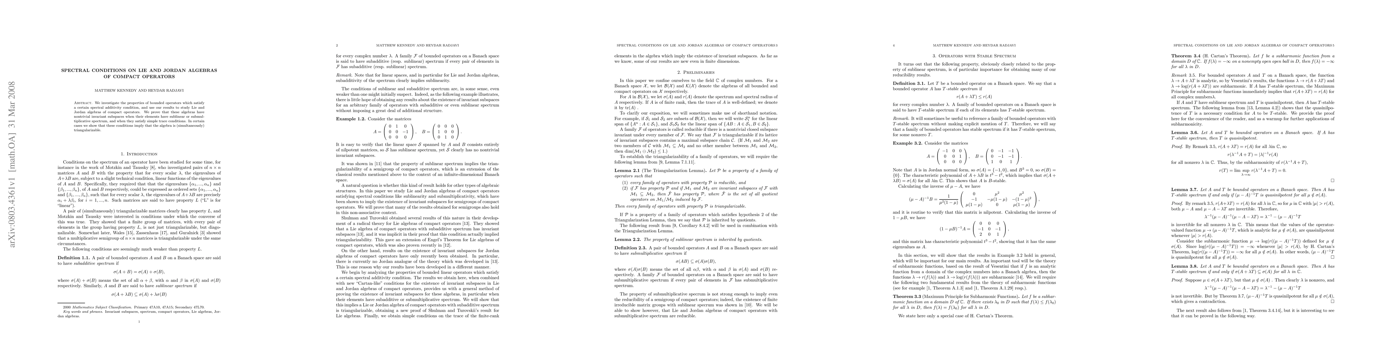 This paper explores spectral additivity conditions in bounded operators, demonstrating that Lie and Jordan algebras of compact operators possess nontrivial invariant subspaces under specific spectral and trace conditions. It also proves that these conditions can lead to the simultaneous triangularizability of the algebra.