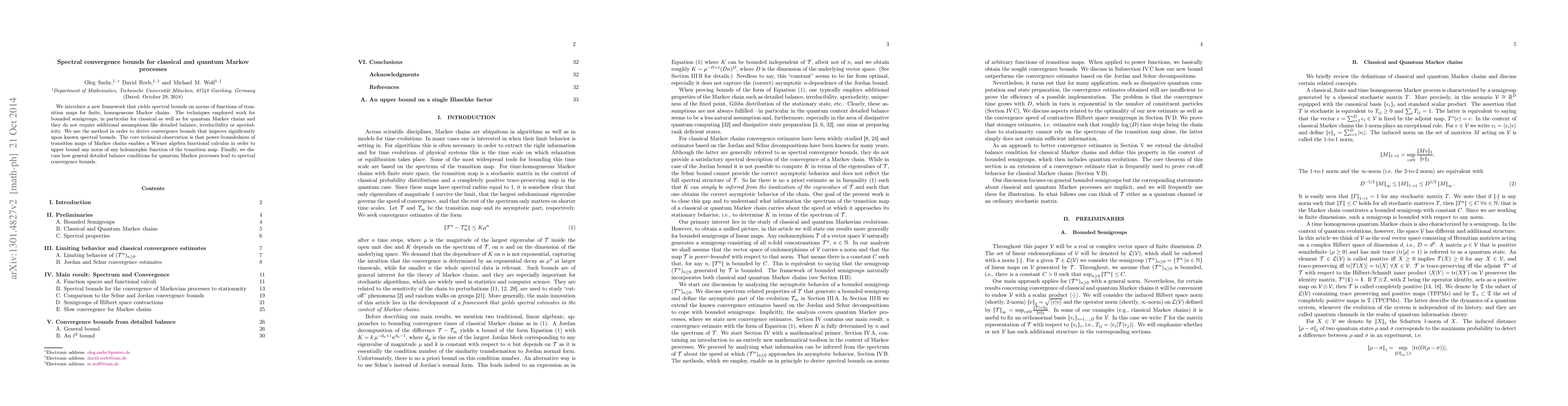 We introduce a new framework that yields spectral bounds on norms of functions of transition maps for finite, homogeneous Markov chains. The techniques employed work for bounded semigroups, in particular for classical as well as for quantum Markov chains and they do not require additional assumptions like detailed balance, irreducibility or aperiodicity. We use the method in order to derive convergence bounds that improve significantly upon known spectral bounds. The core technical observation is that power-boundedness of transition maps of Markov chains enables a Wiener algebra functional calculus in order to upper bound any norm of any holomorphic function of the transition map. Finally, we discuss how general detailed balance conditions for quantum Markov processes lead to spectral convergence bounds.