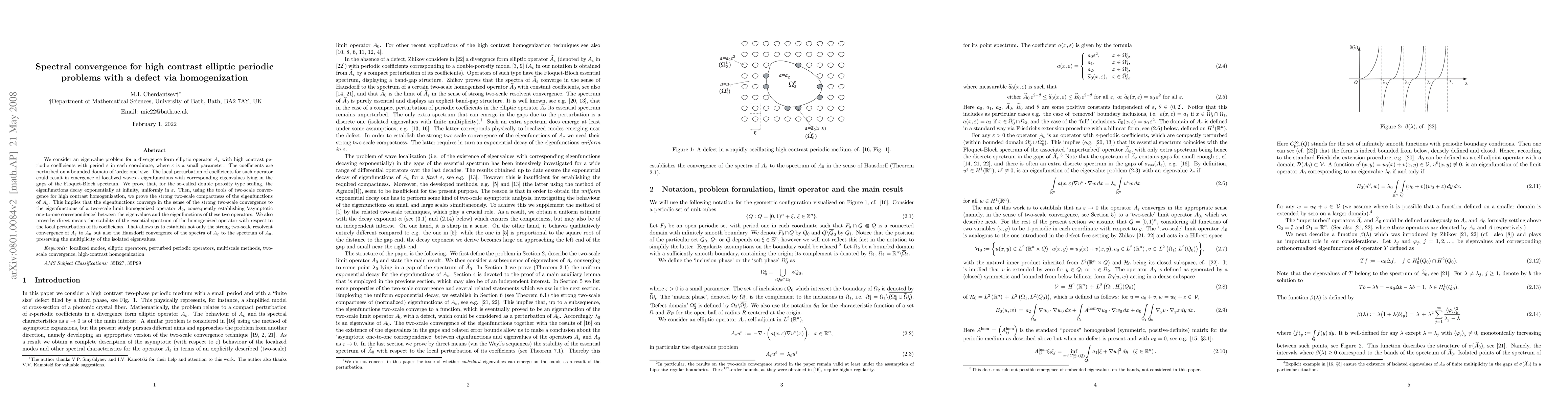 This paper investigates the spectral convergence of high contrast elliptic periodic problems with localized perturbations, proving exponential decay and strong two-scale convergence of eigenfunctions. It establishes an asymptotic one-to-one correspondence between eigenvalues and eigenfunctions of the perturbed and homogenized operators, while also demonstrating stability of the essential spectrum.