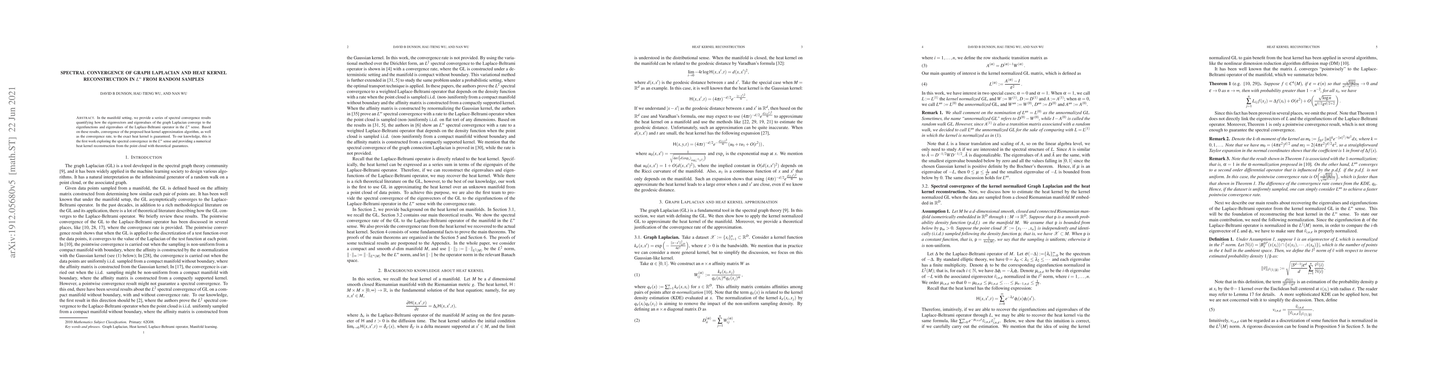 In the manifold setting, we provide a series of spectral convergence results quantifying how the eigenvectors and eigenvalues of the graph Laplacian converge to the eigenfunctions and eigenvalues of the Laplace-Beltrami operator in the $L^\infty$ sense. The convergence rate is also provided. Based on these results, convergence of the proposed heat kernel approximation algorithm, as well as the convergence rate, to the exact heat kernel is guaranteed. To our knowledge, this is the first work exploring the spectral convergence in the $L^\infty$ sense and providing a numerical heat kernel reconstruction from the point cloud with theoretical guarantees.