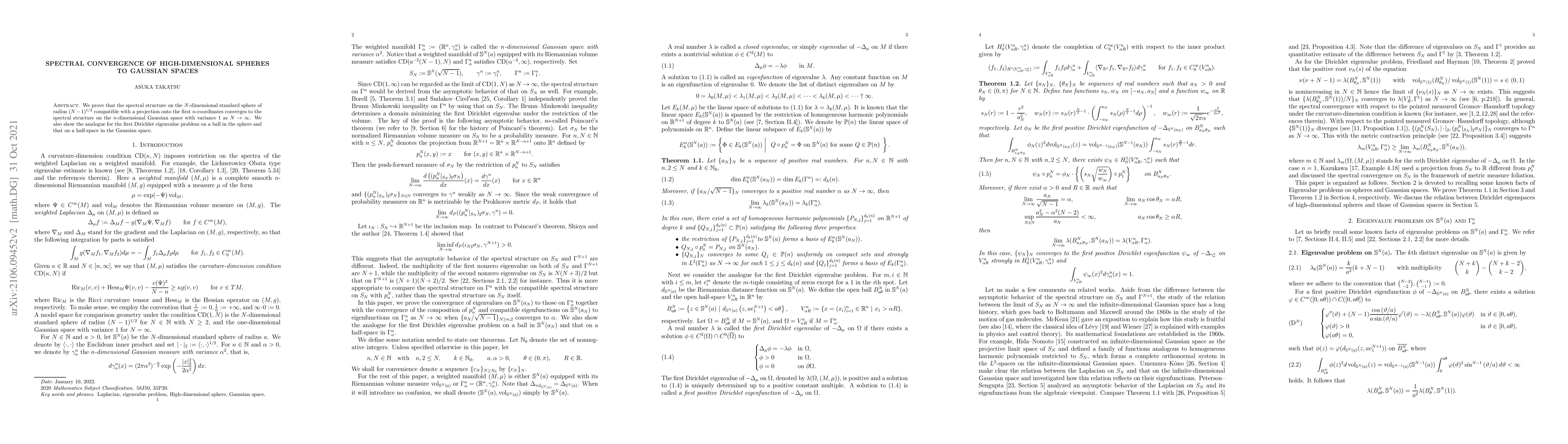 We prove that the spectral structure on the $N$-dimensional standard sphere of radius $(N-1)^{1/2}$ compatible with a projection onto the first $n$-coordinates converges to the spectral structure on the $n$-dimensional Gaussian space with variance $1$ as $N\to \infty$. We also show the analogue for the first Dirichlet eigenvalue and its eigenfunction on a ball in the sphere and on a half-space in the Gaussian space.