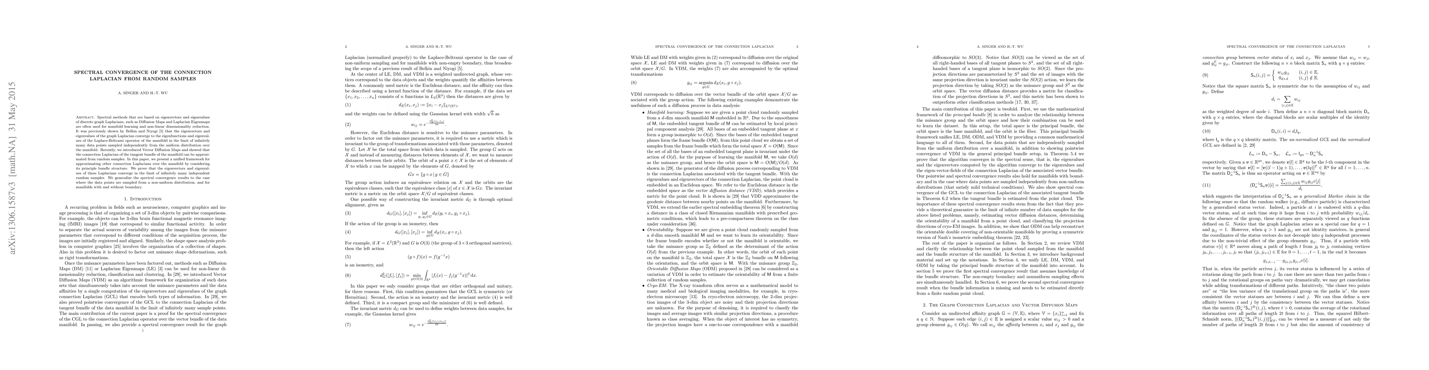 Spectral methods that are based on eigenvectors and eigenvalues of discrete graph Laplacians, such as Diffusion Maps and Laplacian Eigenmaps are often used for manifold learning and non-linear dimensionality reduction. It was previously shown by Belkin and Niyogi \cite{belkin_niyogi:2007} that the eigenvectors and eigenvalues of the graph Laplacian converge to the eigenfunctions and eigenvalues of the Laplace-Beltrami operator of the manifold in the limit of infinitely many data points sampled independently from the uniform distribution over the manifold. Recently, we introduced Vector Diffusion Maps and showed that the connection Laplacian of the tangent bundle of the manifold can be approximated from random samples. In this paper, we present a unified framework for approximating other connection Laplacians over the manifold by considering its principle bundle structure. We prove that the eigenvectors and eigenvalues of these Laplacians converge in the limit of infinitely many independent random samples. We generalize the spectral convergence results to the case where the data points are sampled from a non-uniform distribution, and for manifolds with and without boundary.