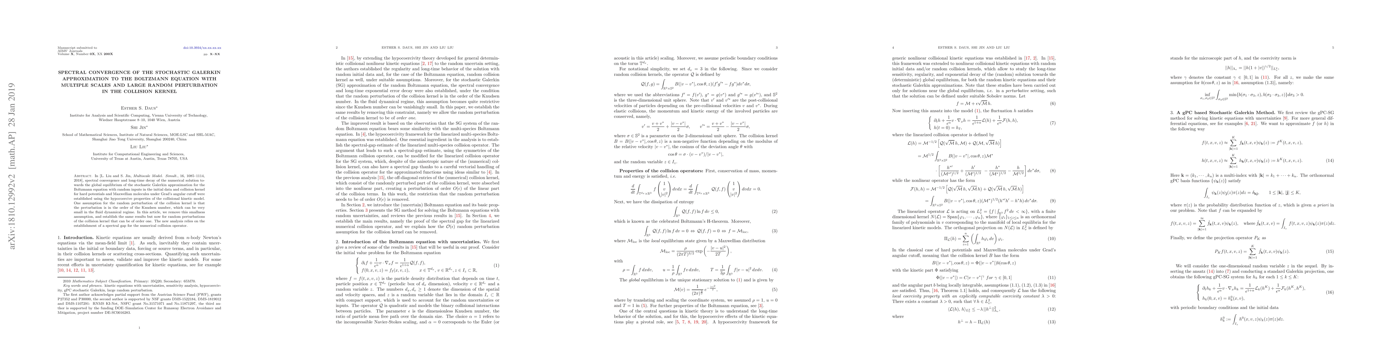In [L. Liu and S. Jin, Multiscale Model. Simult., 16, 1085-1114, 2018], spectral convergence and long-time decay of the numerical solution towards the global equilibrium of the stochastic Galerkin approximation for the Boltzmann equation with random inputs in the initial data and collision kernel for hard potentials and Maxwellian molecules under Grad's angular cutoff were established using the hypocoercive properties of the collisional kinetic model. One assumption for the random perturbation of the collision kernel is that the perturbation is in the order of the Knudsen number, which can be very small in the fluid dynamical regime. In this article, we remove this smallness assumption, and establish the same results but now for random perturbations of the collision kernel that can be of order one. The new analysis relies on the establishment of a spectral gap for the numerical collision operator.