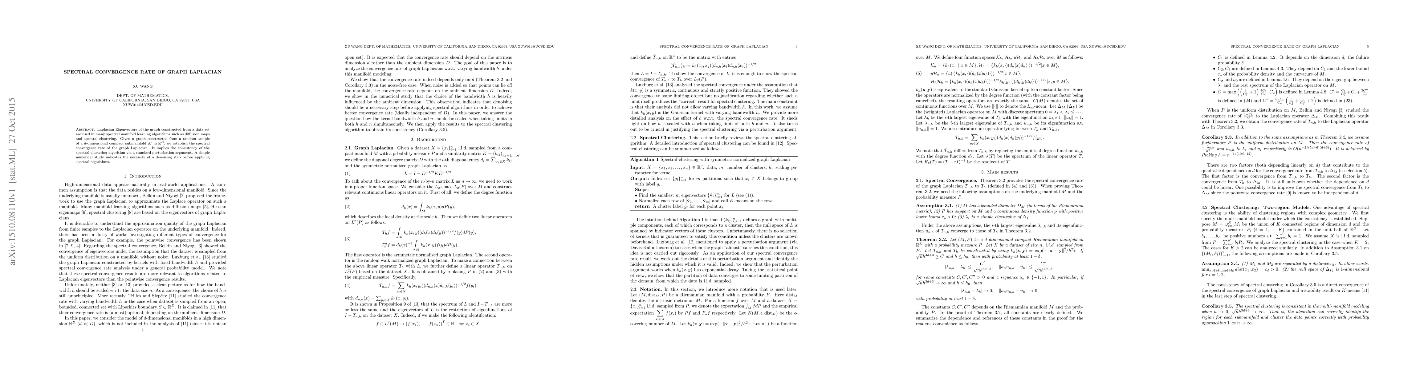 This paper establishes the spectral convergence rate of the graph Laplacian for graphs derived from random samples of a $d$-dimensional submanifold, ensuring the consistency of spectral clustering algorithms. A numerical study highlights the importance of a denoising step prior to applying spectral methods.