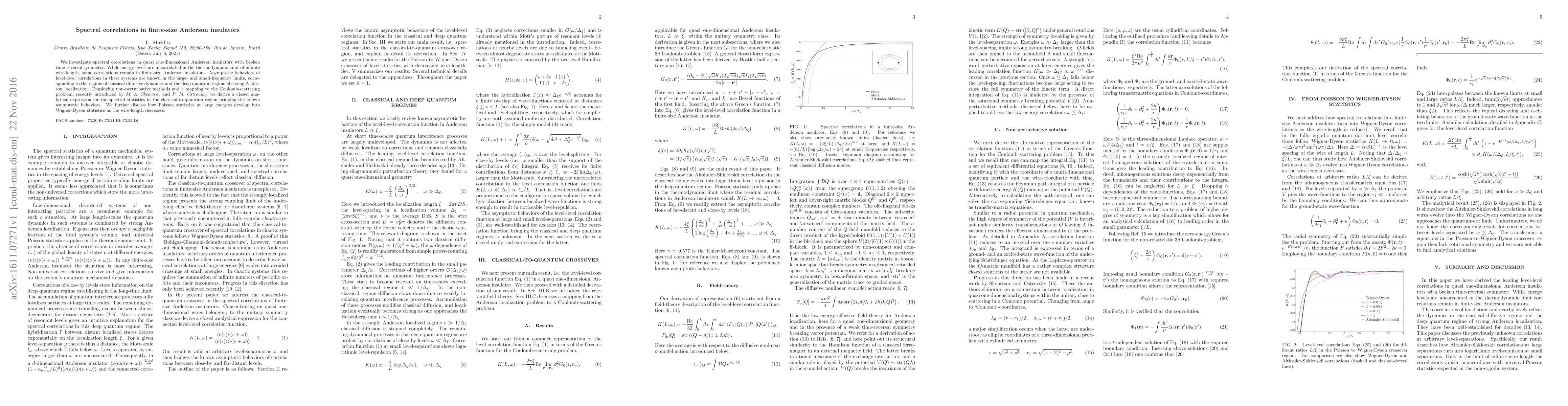 This paper explores spectral correlations in finite-size quasi one-dimensional Anderson insulators with broken time-reversal symmetry, deriving a closed analytical expression for the spectral statistics that bridges classical and quantum regimes. It also discusses the transition from Poisson to Wigner-Dyson statistics as system size decreases.