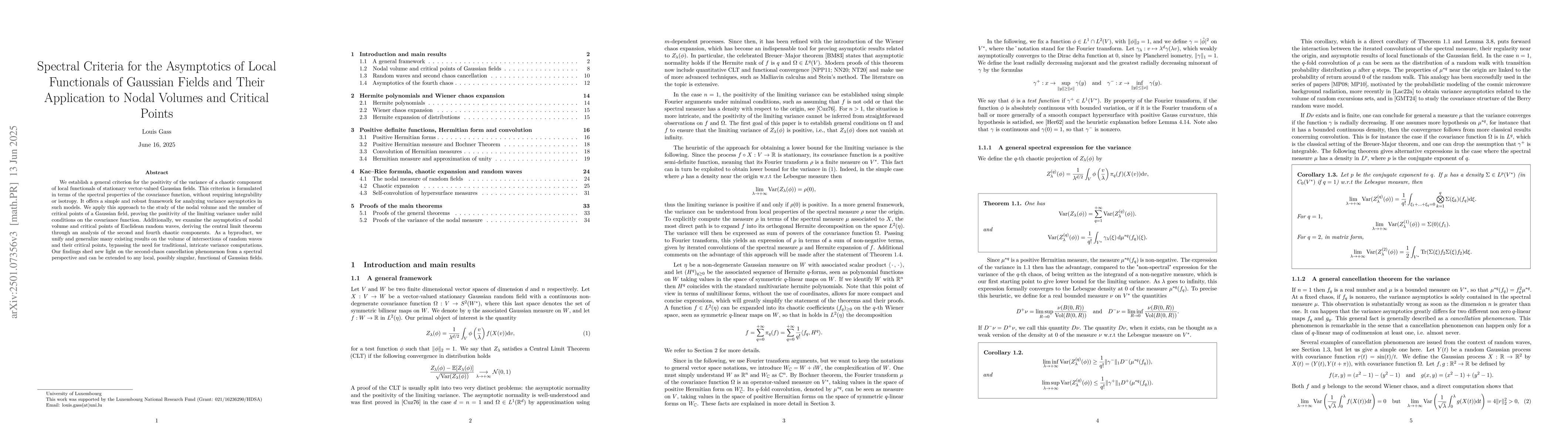 In this paper, we establish a general criterion for the positivity of the variance of the second chaotic component of local functionals of stationary vector-valued Gaussian fields. This criterion is formulated in terms of the spectral properties of the covariance function, without requiring assumptions of integrability or isotropy. It offers a simple and robust framework for analyzing variance asymptotics in such models. We apply this approach to the study of the nodal volume and the number of critical points of a Gaussian field, proving the positivity of the limiting variance under mild conditions on the covariance function. Additionally, we examine the asymptotics of the particular model of Euclidean random waves, deriving the central limit theorem through an analysis of the second and fourth chaotic components, thereby resolving an open question in large dimensions. As a byproduct, we condense and generalize many existing results on the volume of intersections of random waves, bypassing the need for traditional, intricate variance computations. Our findings shed new light on the second-chaos cancellation phenomenon from a spectral perspective and can be extended to any local, possibly singular, functional of Gaussian fields.