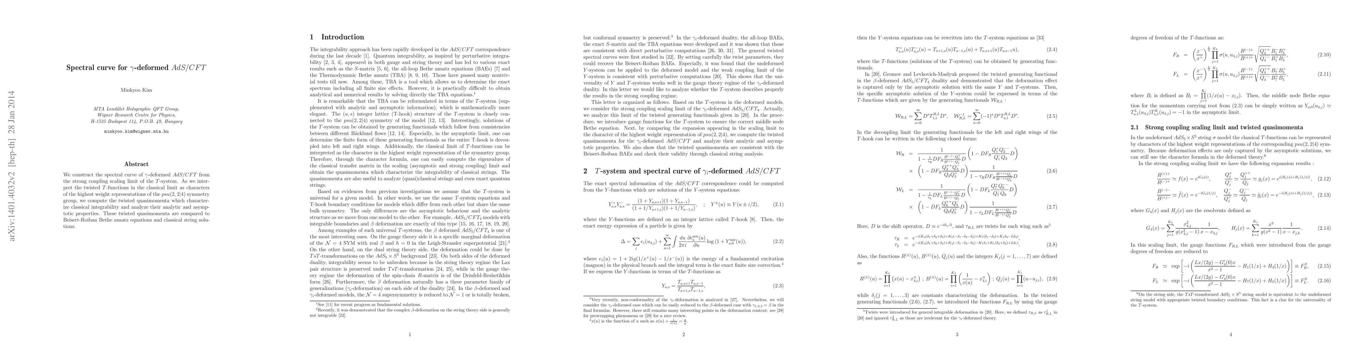 This paper constructs the spectral curve for gamma-deformed AdS/CFT from the strong coupling limit of the T-system, interpreting twisted T-functions as characters of the psu(2,2|4) symmetry group, and analyzes the corresponding quasimomenta in relation to the Beisert-Roiban Bethe ansatz and classical string solutions.