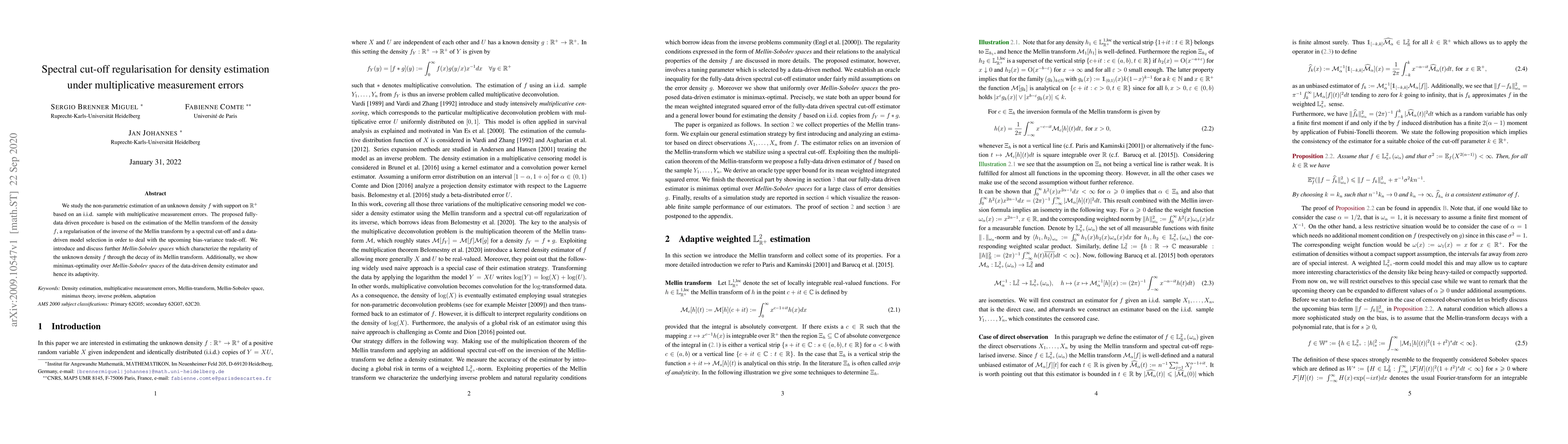 The work stands out by combining Mellin-Sobolev spaces with spectral cut-off regularization for density estimation under multiplicative measurement errors, providing a minimax-optimal adaptive estimator.
