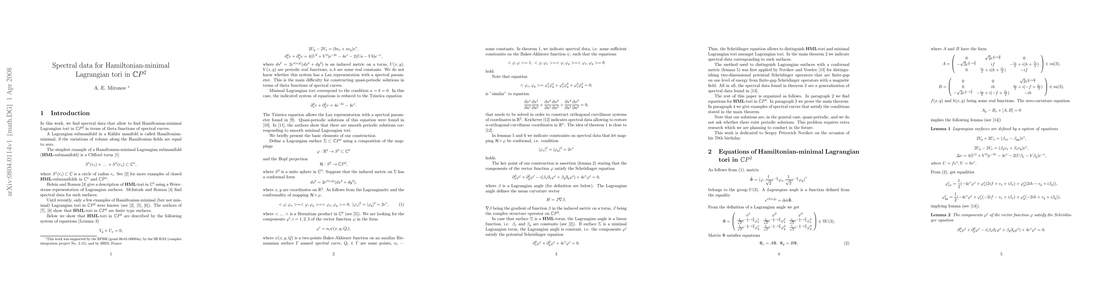 This research identifies spectral data that enable the determination of Hamiltonian-minimal Lagrangian tori in complex projective space $CP^2$ through the use of theta functions derived from spectral curves. The findings provide a novel method for characterizing these geometric objects.