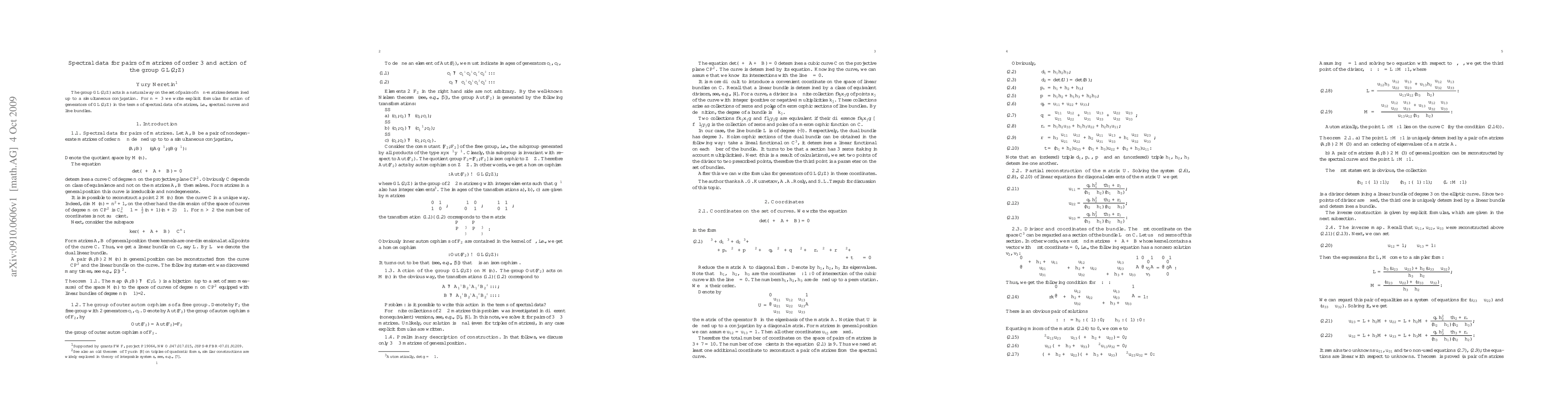 The group $GL(2,Z)$ acts in a natural way on the set of pairs of $n\times n$-matrices determined up to a simultaneous conjugation. For $n=3$ we write explicit formulas for action of generators of $GL(2,Z)$ in the terms of spectral data of matrices, i.e., spectral curves and line bundles.