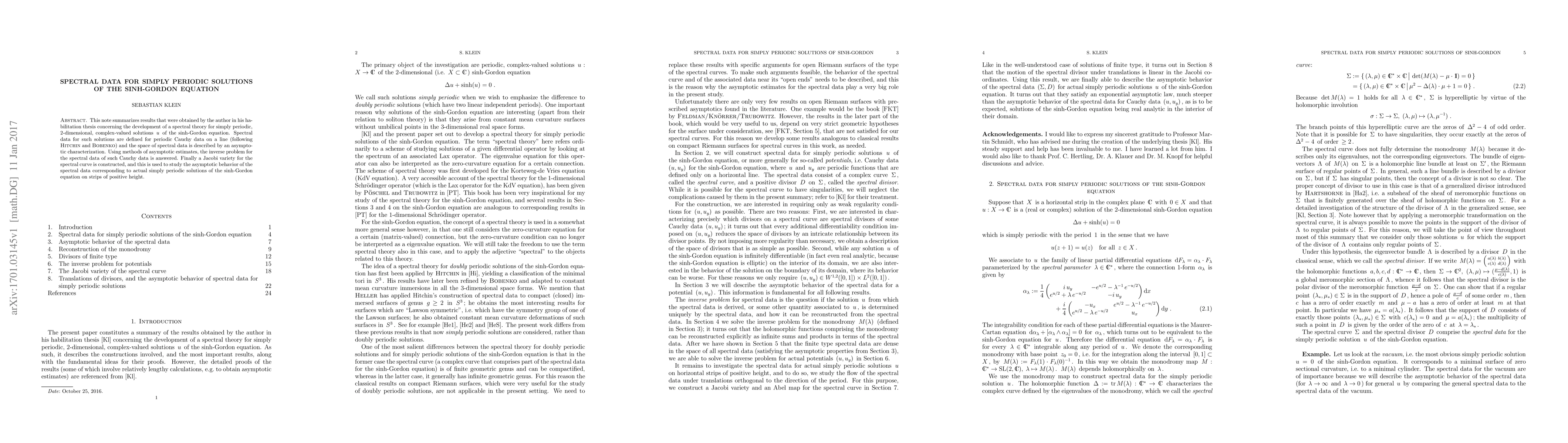 This note summarizes results that were obtained by the author in his habilitation thesis (arXiv:1607.08792) concerning the development of a spectral theory for simply periodic, 2-dimensional, complex-valued solutions of the sinh-Gordon equation. Spectral data for such solutions are defined for periodic Cauchy data on a line (following Hitchin and Bobenko) and the space of spectral data is described by an asymptotic characterization. Using methods of asymptotic estimates, the inverse problem for the spectral data of such Cauchy data is answered. Finally a Jacobi variety for the spectral curve is constructed, and this is used to study the asymptotic behavior of the spectral data corresponding to actual simply periodic solutions of the sinh-Gordon equation on strips of positive height.