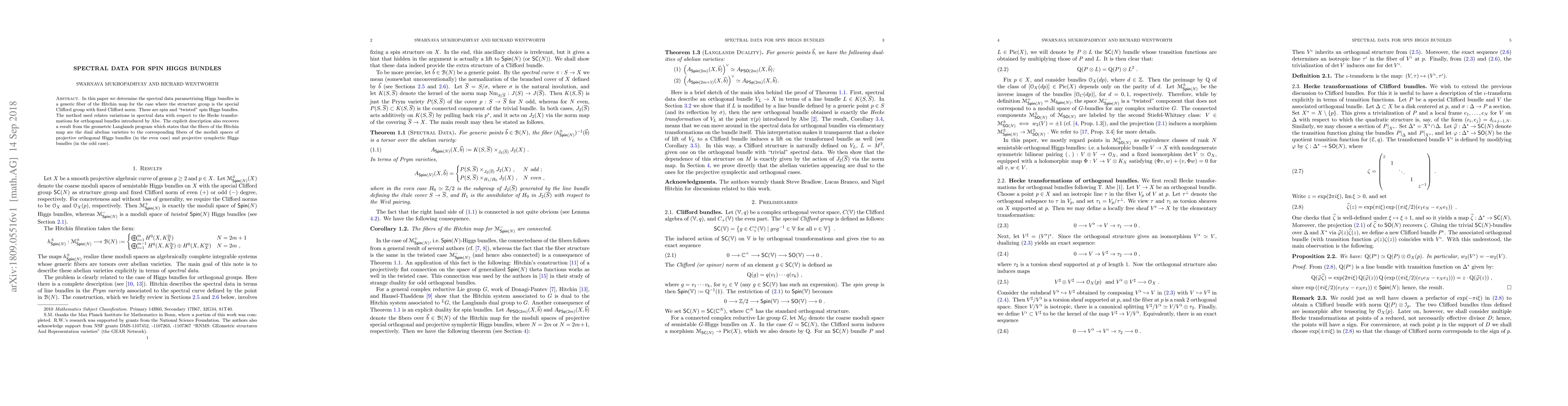 This paper determines spectral data for spin Higgs bundles, using Abe's Hecke transformation method, and relates these to dual abelian varieties within the geometric Langlands program. The findings apply to special Clifford groups with fixed Clifford norm.