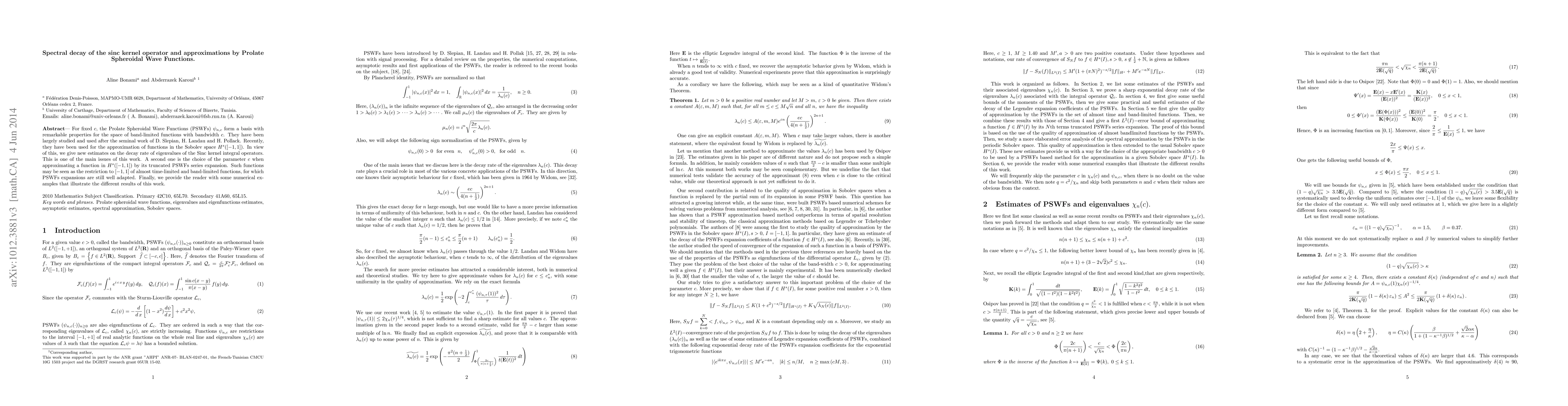 This paper investigates the spectral decay of the Sinc kernel operator and its approximation using Prolate Spheroidal Wave Functions (PSWFs). It provides new estimates on the decay rate of eigenvalues and discusses the optimal choice of the parameter $c$ for approximating functions in the Sobolev space $H^s([-1,1])$ using truncated PSWFs series expansions.