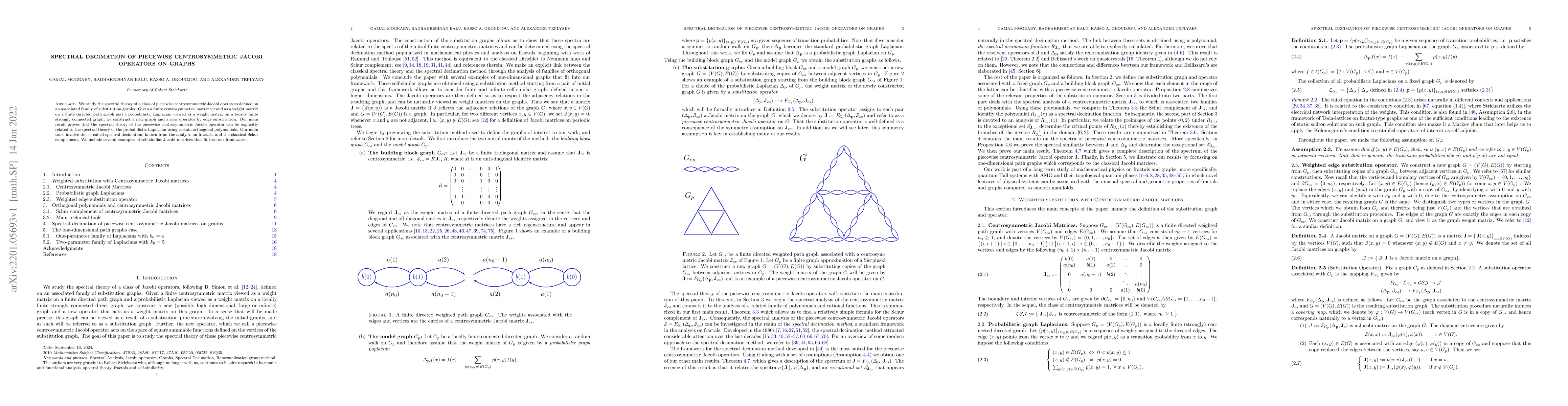 This paper explores the spectral properties of piecewise centrosymmetric Jacobi operators on substitution graphs, demonstrating a connection between these operators and probabilistic Laplacians via spectral decimation and orthogonal polynomials. The study includes examples of self-similar Jacobi matrices.