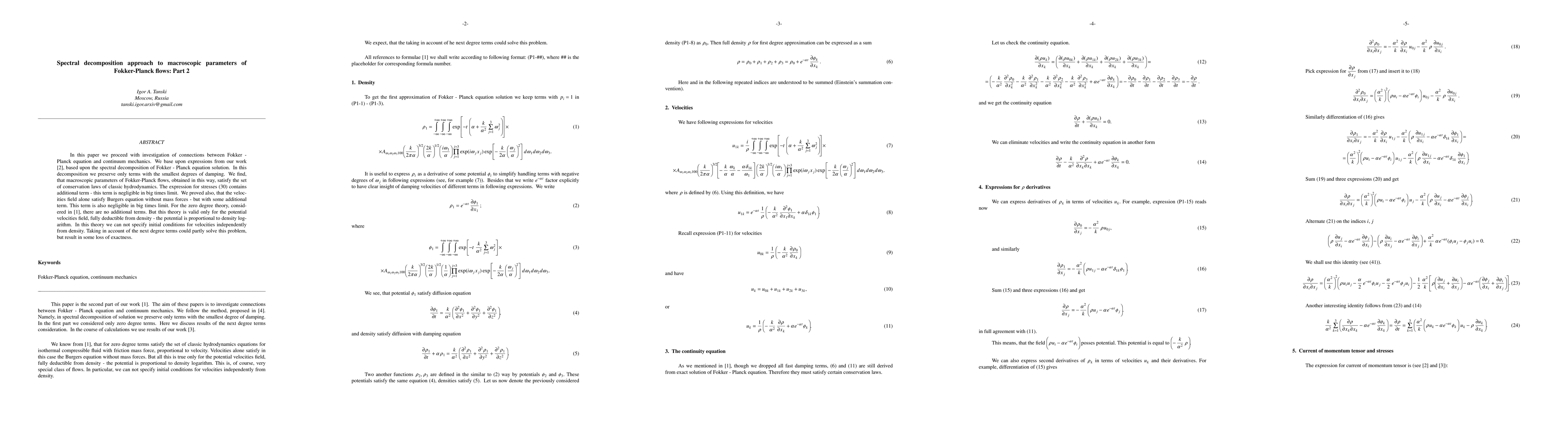 In this paper we proceed with investigation of connections between Fokker - Planck equation and continuum mechanics. We base upon expressions from our work [2], based upon the spectral decomposition of Fokker - Planck equation solution. In this decomposition we preserve only terms with the smallest degrees of damping. We find, that macroscopic parameters of Fokker-Planck flows, obtained in this way, satisfy the set of conservation laws of classic hydrodynamics. The expression for stresses (30) contains additional term - this term is negligible in big times limit. We proved also, that the velocities field alone satisfy Burgers equation without mass forces - but with some additional term. This term is also negligible in big times limit. For the zero degree theory, considered in [1], there are no additional terms. But this theory is valid only for the potential velocities field, fully deductible from density - the potential is proportional to density logarithm. In this theory we can not specify initial conditions for velocities independently from density. Taking in account of the next degree terms could partly solve this problem, but result in some loss of exactness.