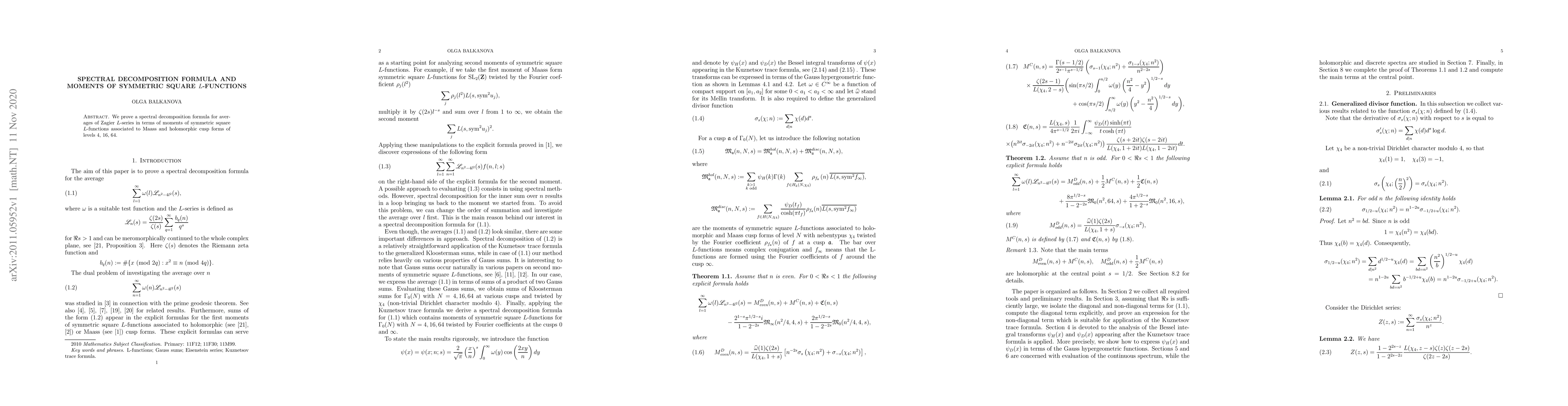 Summary: This paper establishes a spectral decomposition formula linking averages of Zagier L-series to moments of symmetric square L-functions, focusing on Maass and holomorphic cusp forms at specific levels: 4, 16, and 64. The results provide deeper insights into the relationships between these L-functions.