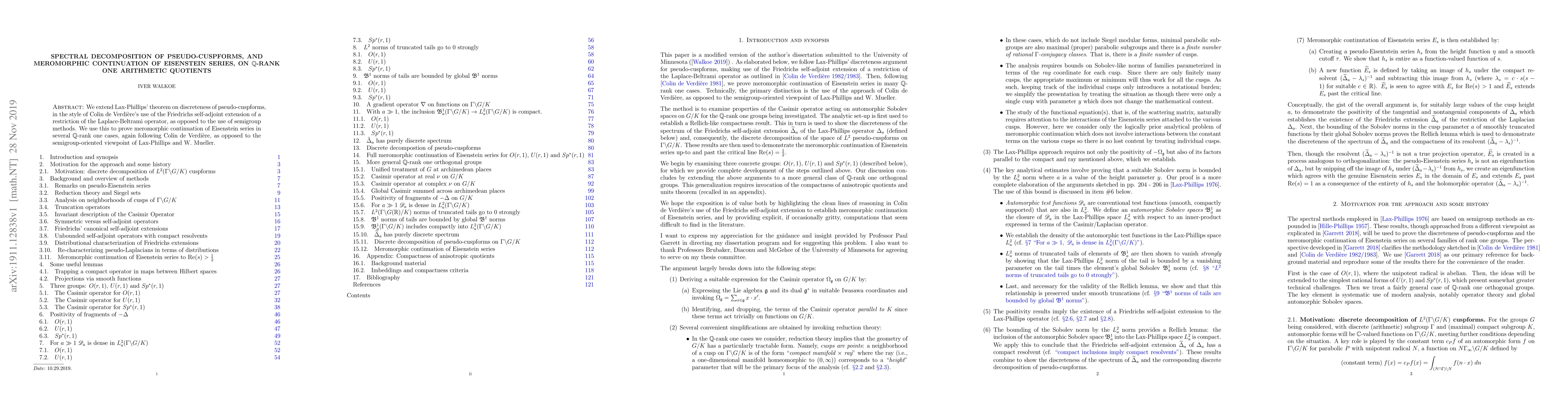 We extend Lax-Phillips' theorem on discreteness of pseudo-cuspforms, in the style of Colin de Verdi{\`e}re's use of the Friedrichs self-adjoint extension of a restriction of the Laplace-Beltrami operator, as opposed to the use of semigroup methods. We use this to prove meromorphic continuation of Eisenstein series in several $\mathbb{Q}$-rank one cases, again following Colin de Verdi{\`e}re, as opposed to the semigroup-oriented viewpoint of Lax-Phillips and W. Mueller.