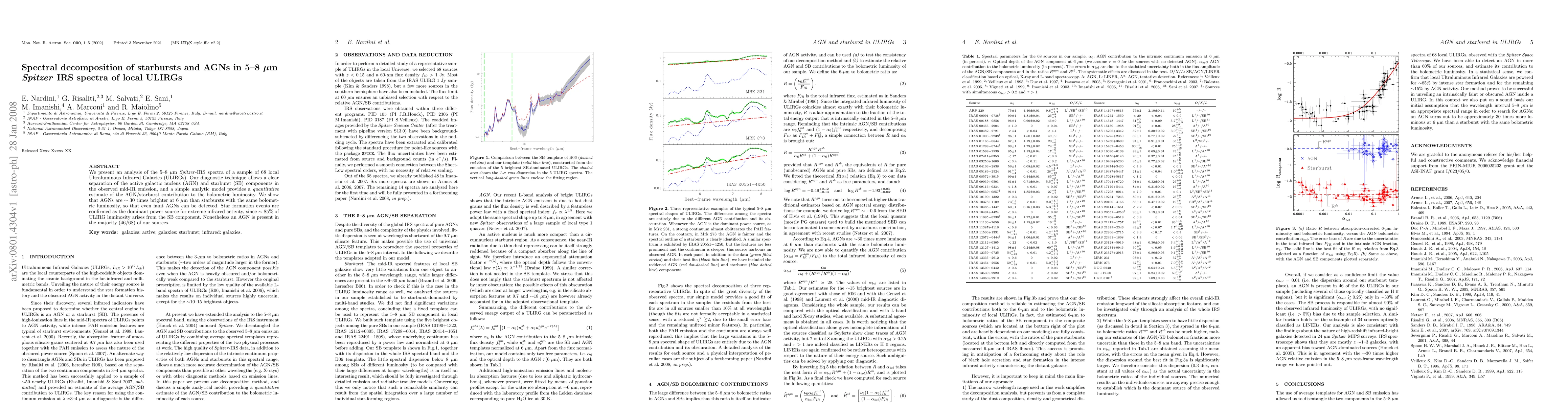 We present an analysis of the 5-8 micron Spitzer-IRS spectra of a sample of 68 local Ultraluminous Infrared Galaxies (ULIRGs). Our diagnostic technique allows a clear separation of the active galactic nucleus (AGN) and starburst (SB) components in the observed mid-IR emission, and a simple analytic model provides a quantitative estimate of the AGN/starburst contribution to the bolometric luminosity. We show that AGNs are ~30 times brighter at 6 micron than starbursts with the same bolometric luminosity, so that even faint AGNs can be detected. Star formation events are confirmed as the dominant power source for extreme infrared activity, since ~85% of ULIRG luminosity arises from the SB component. Nonetheless an AGN is present in the majority (46/68) of our sources.