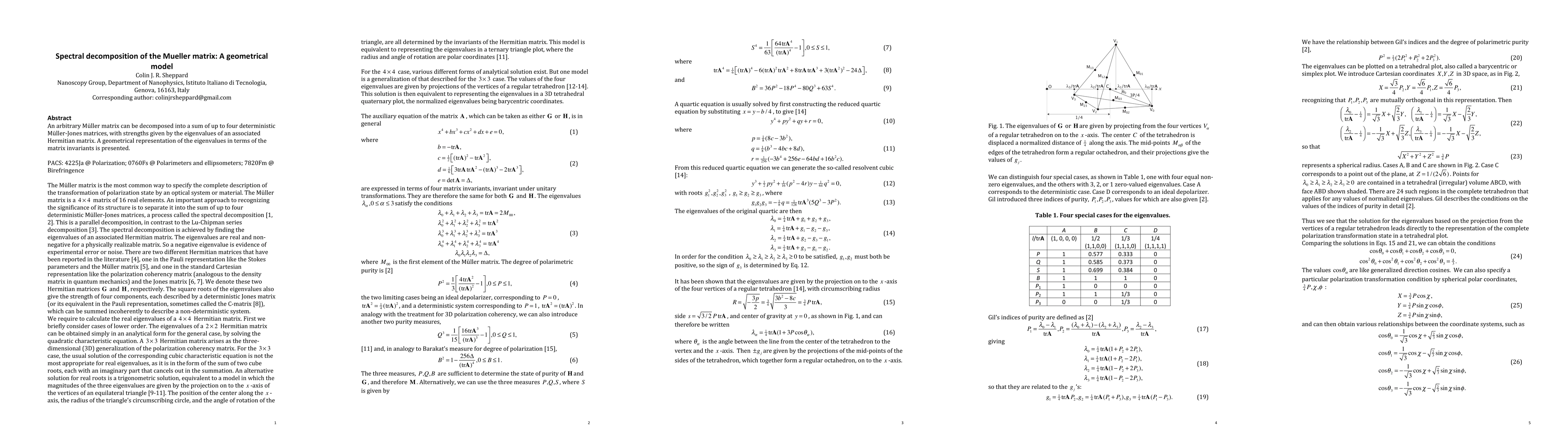 This paper proposes a spectral decomposition method for Mueller matrices, expressing them as a sum of up to four Mueller-Jones matrices, with the decomposition strengths determined by the eigenvalues of a related Hermitian matrix. It also introduces a geometrical interpretation of these eigenvalues using matrix invariants.